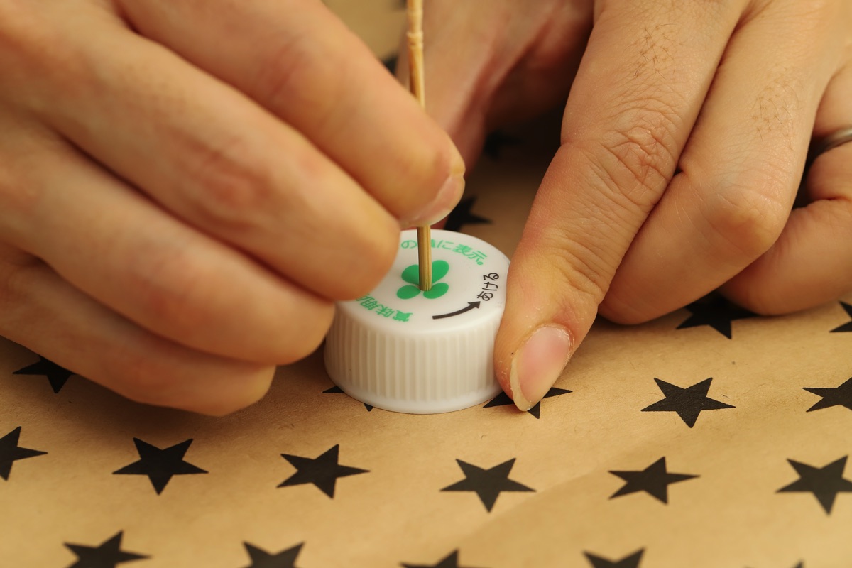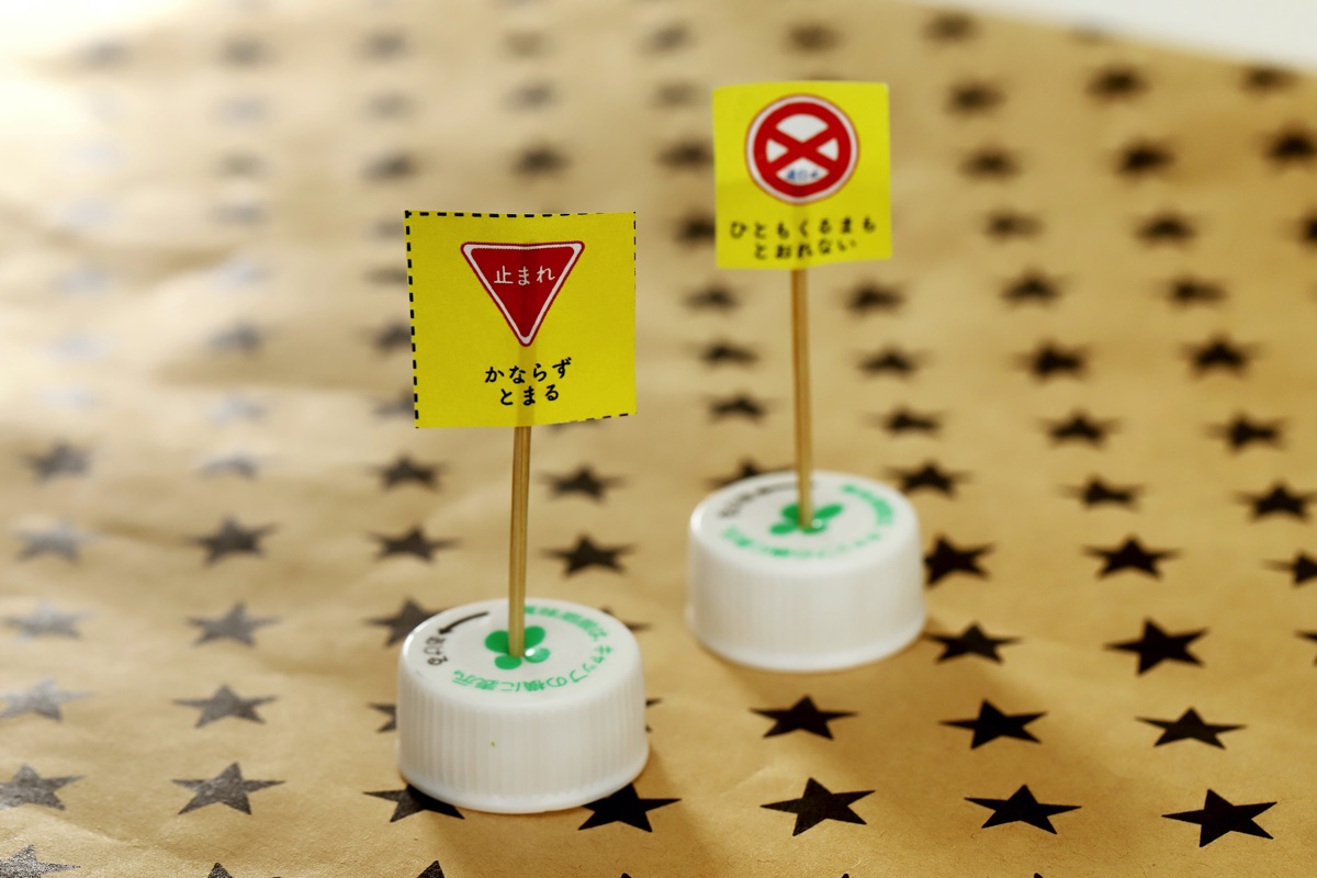 PETボトルのふたの中央をきりで穴をあけ、つまようじをさす。道路標識マークを貼ったら完成!特に注意したい危険ポイントには、これを置いて目印に!マップにのせて、標識も一緒におぼえちゃおう!