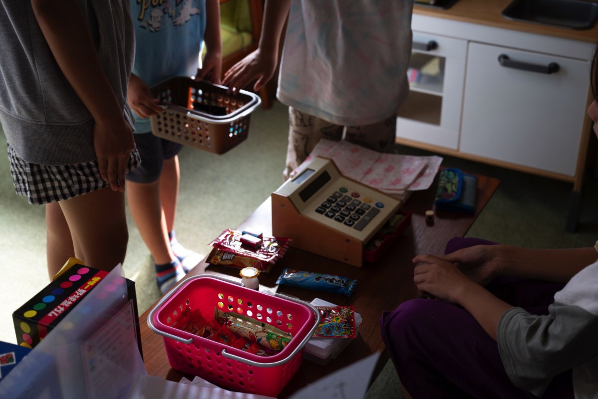 自分たちで駄菓子の合計額を計算してみたり、買った駄菓子をその場で食べたりと、思い思いの時間を過ごしている。