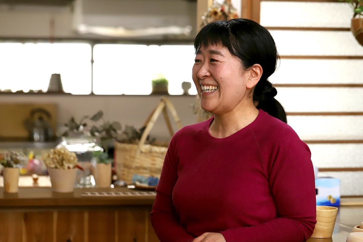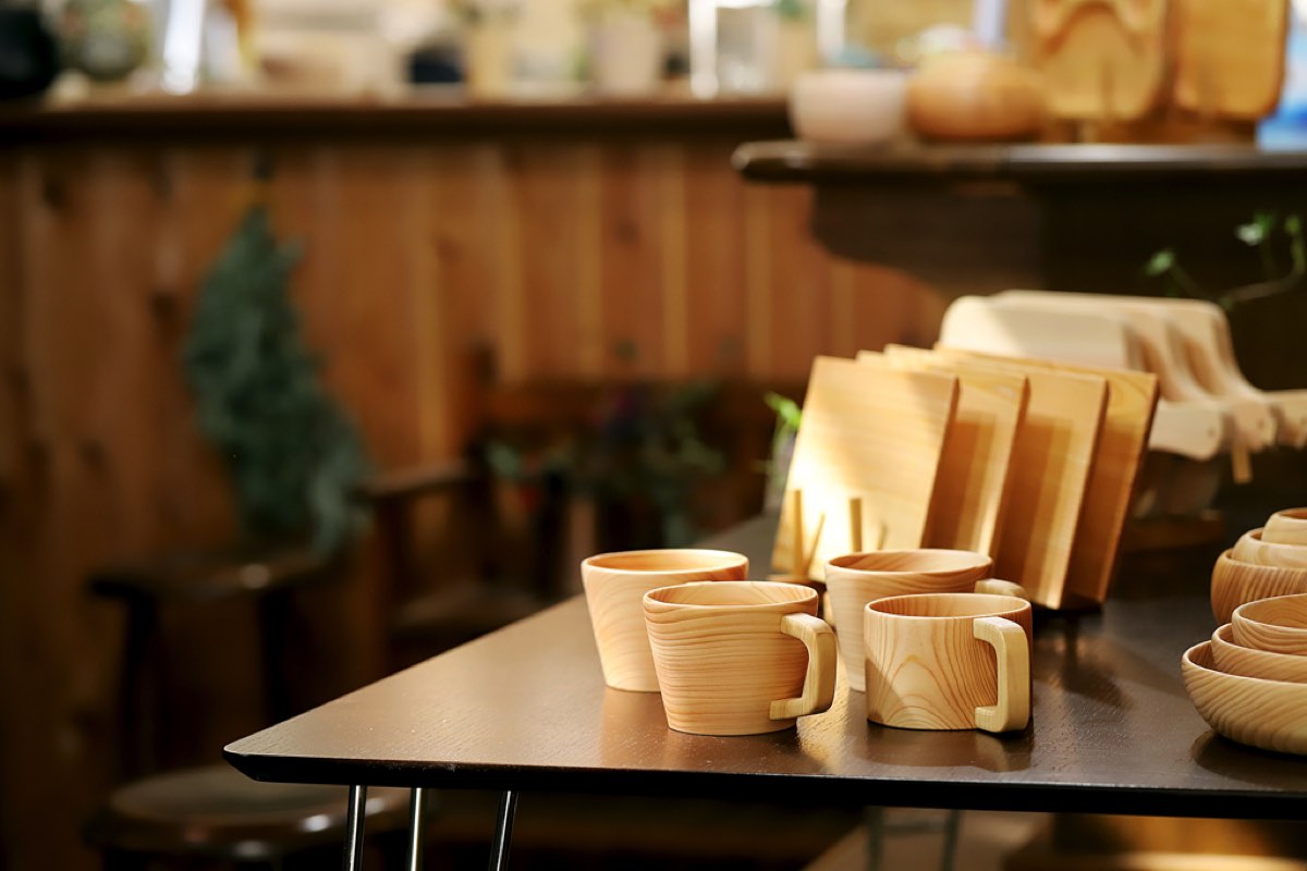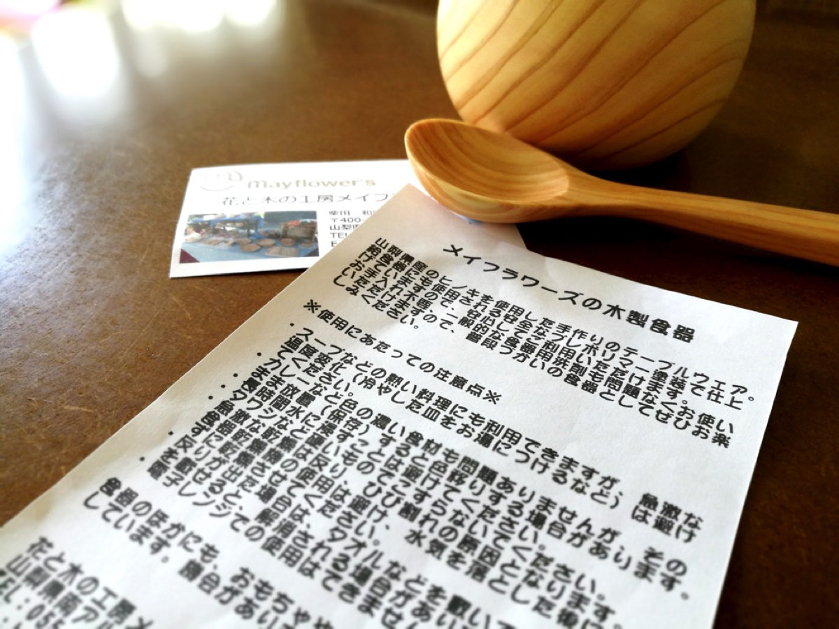 今回紹介する『花と木の工房メイフラワーズ』は、南アルプス市に居をかまえ、削り出し担当の夫・和也さんと塗装担当の妻・芽衣子さんのご夫婦で、木の食器をメインに山梨県産のヒノキを使った作品を手掛けている。