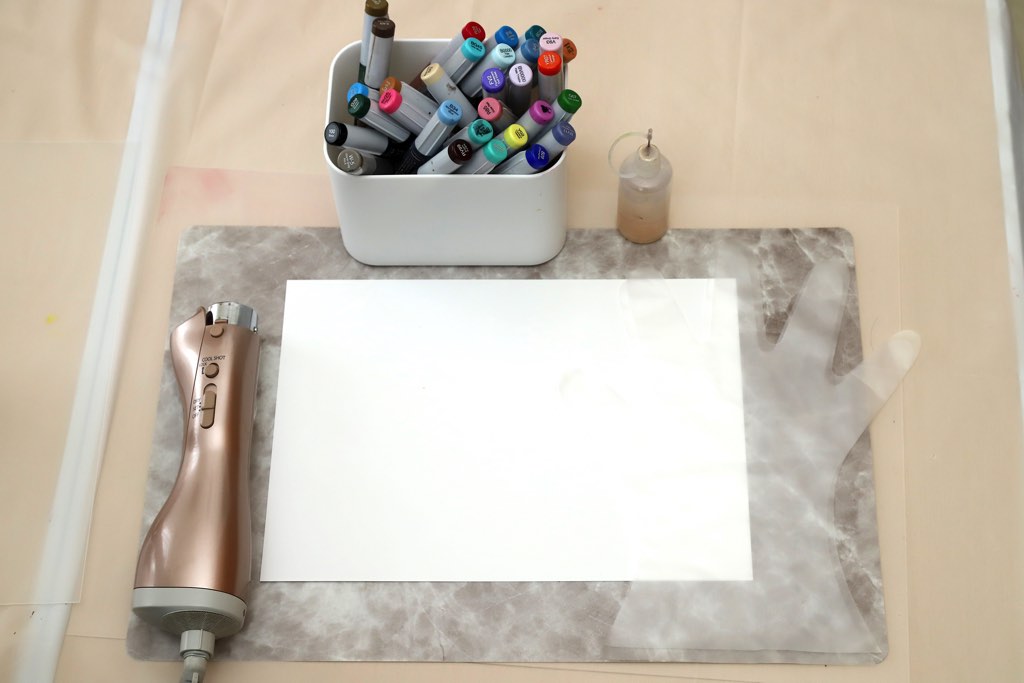 今回のアルコールインクアートで使うのは、ユポ紙、無水アルコール、アルコールインク(コピック)、ドライヤー。