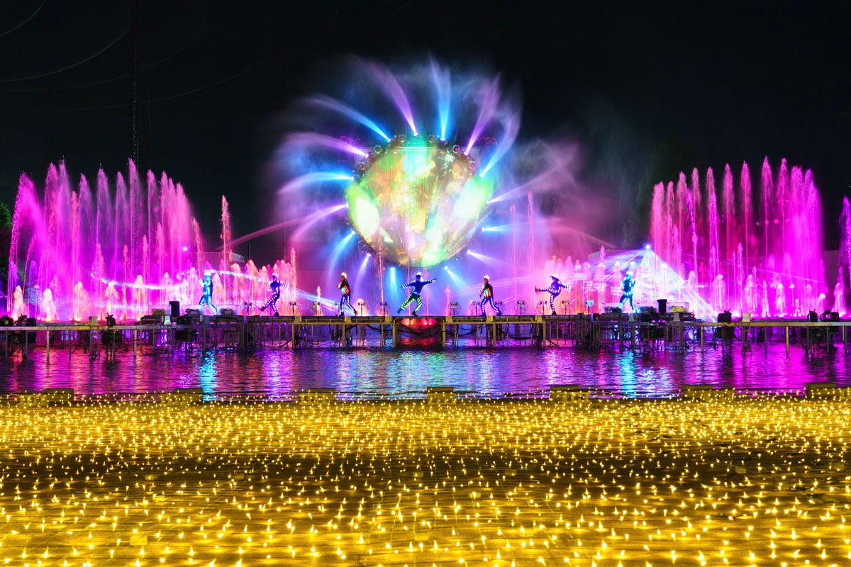 - 波のプールを使った迫力の噴水イルミネーションショーも