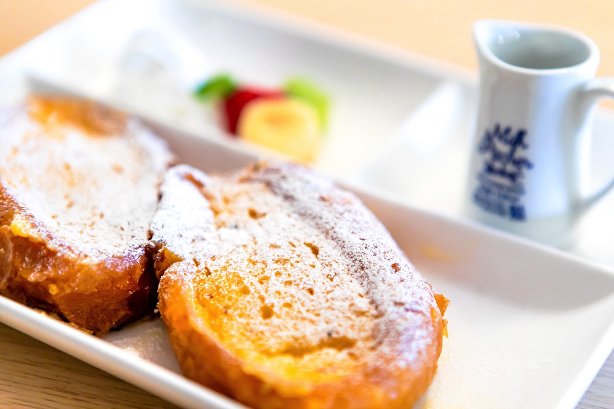笛吹市国道20号沿いにある、フレンチトースト専門店。2階の座敷は子連れでゆったりとくつろぐことができ、ママたちの憩いの場に。「おこさまフレンチトースト」は、大人用と変わらないクオリティでいただける。