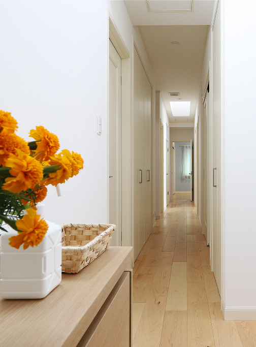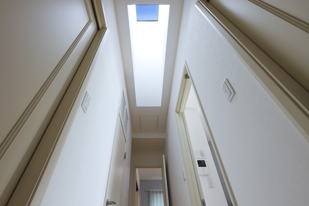 暗くなりがちな廊下に明かりを届けるのは、自然光をダイレクトに取り込む天窓。照明とは一味違った健康的な光は、室内をより明るい印象にしてくれる。