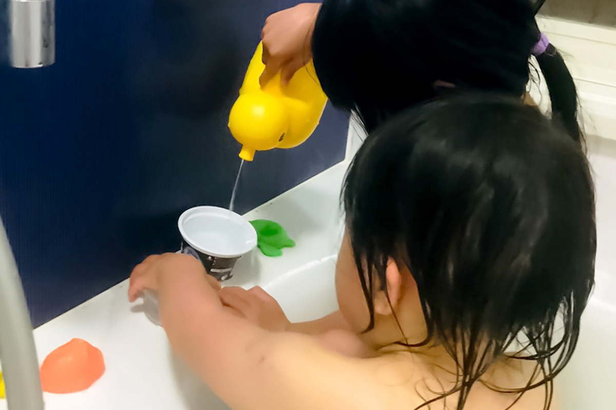 子どもたちはお風呂が大好きで、ここでも姉妹で大盛り上がり!