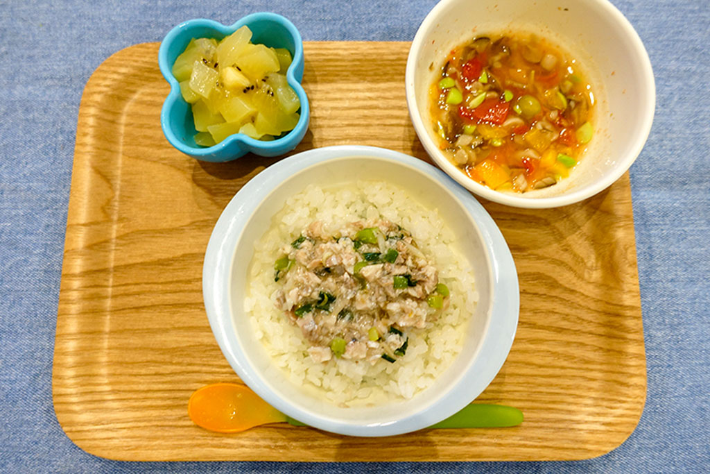 付け足すメニューは、トマトベースに玉ねぎ、ズッキーニ、パルシステムのお魚ボールをコンソメ味に味付けた物をよく出します。