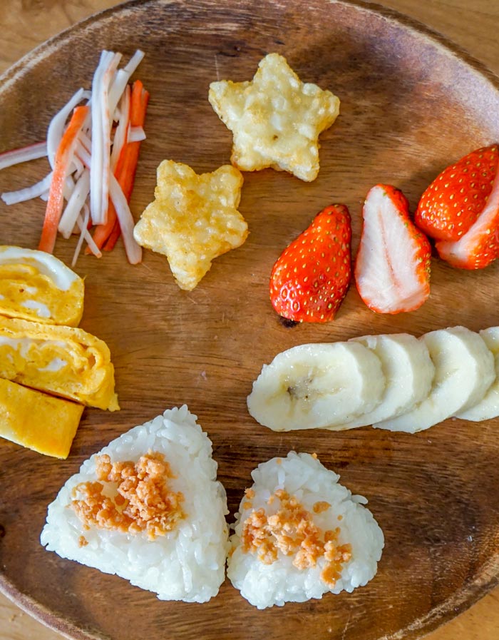 おにぎり・みそ汁・卵焼き・ポテト・フルーツ以外は長男が食べないので、いつもこのメニュー。