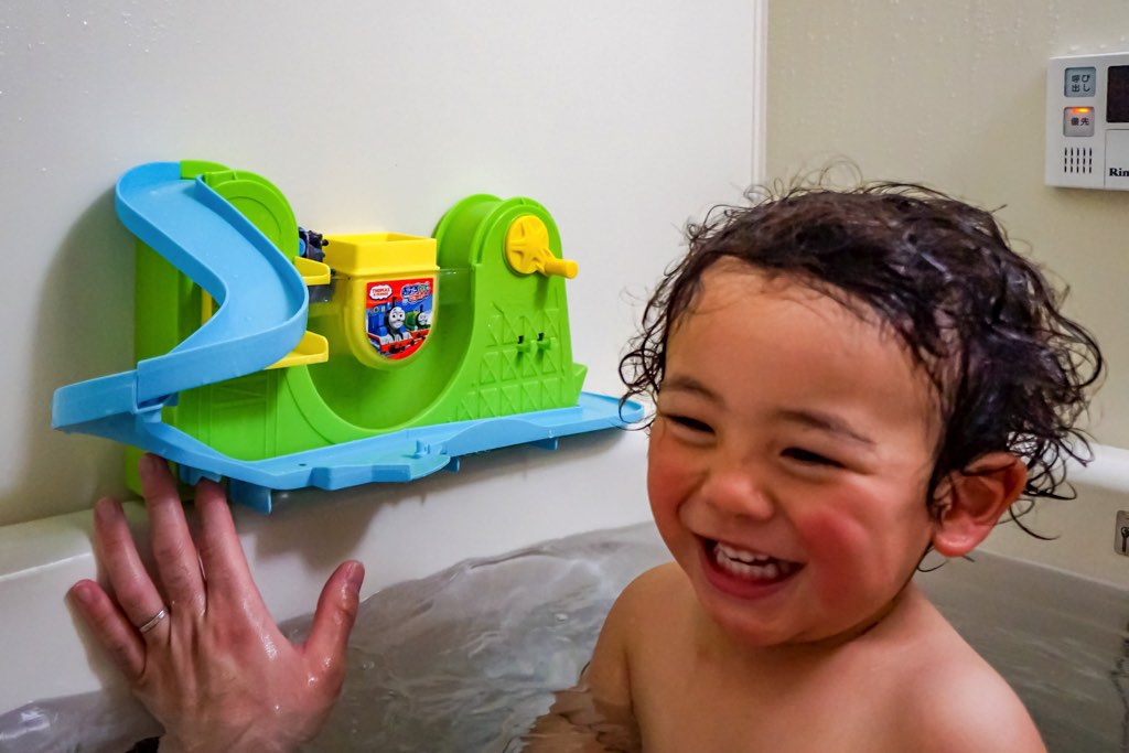 ここでも「入りたくない!」とイヤイヤを発動するも、おもちゃで釣って何とかお風呂へ。