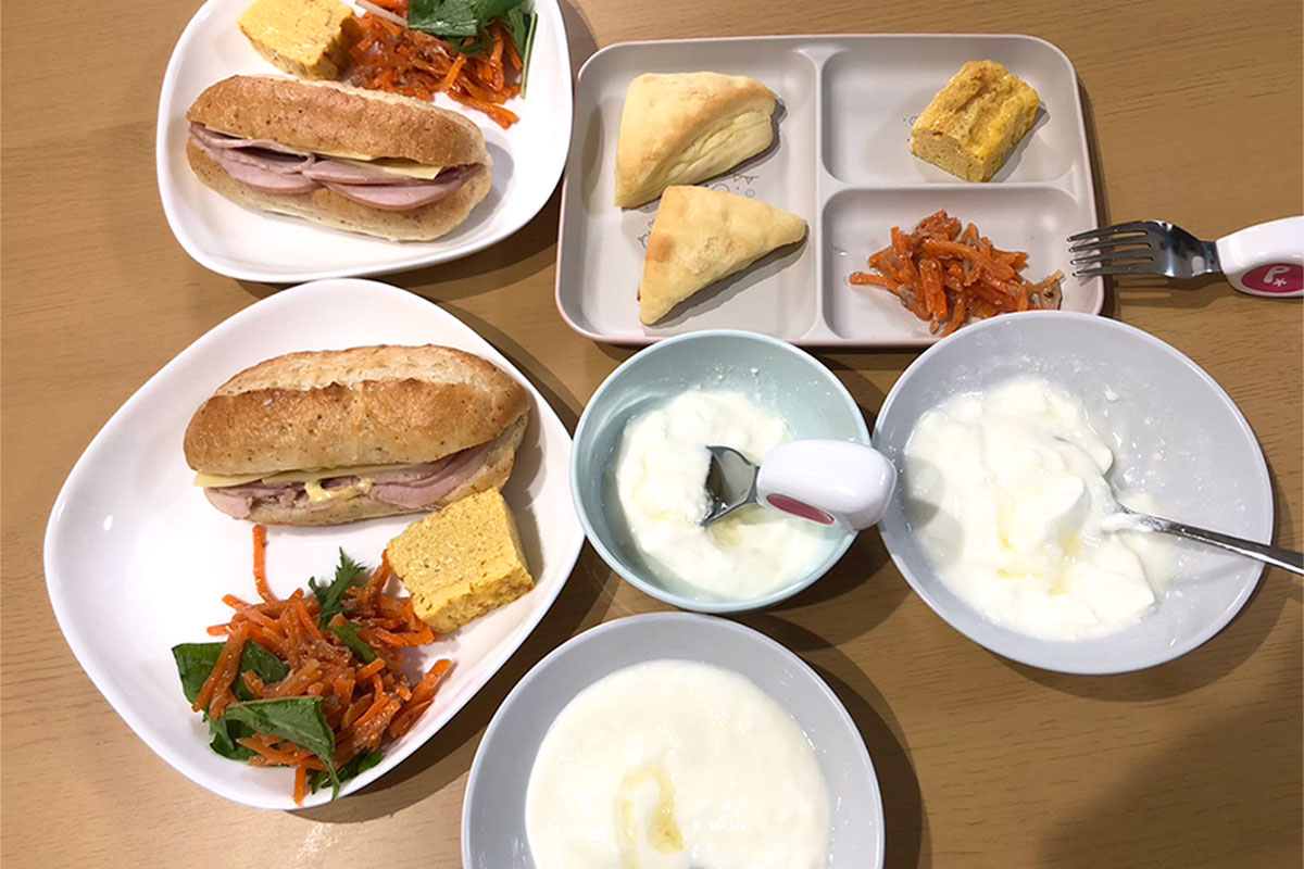 定番に出すのはパンとバナナヨーグルト・大人にはサラダがつき、たまにスープも。お昼のお弁当用に作って余ったおかずもちょっとだけ盛りつけて朝ごはんを食べる。