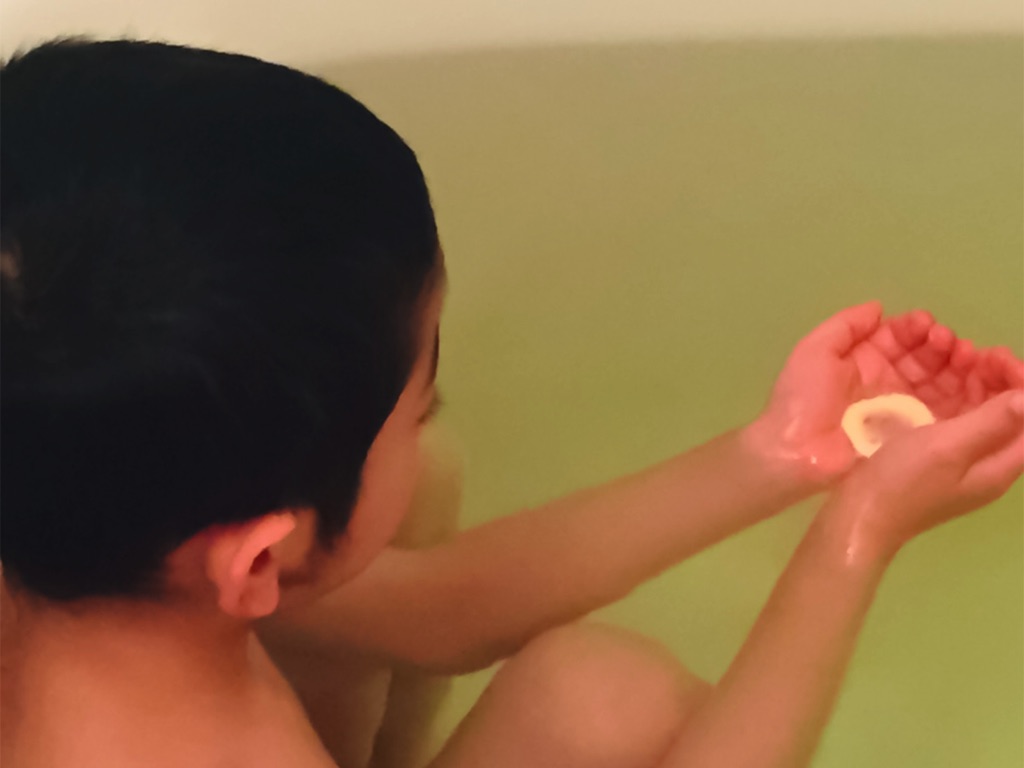 「お風呂めんどくさい~…」とゴネることもあるけど、最近は固形の入浴剤が溶ける様子を見るのが楽しいらしく、それをエサにお風呂へ誘導。