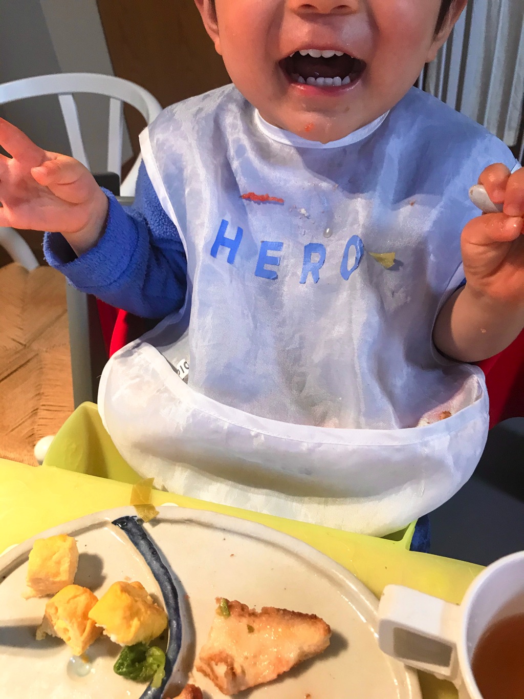 長男が朝食を食べ終わるころには服やテーブルはグチャグチャ…。