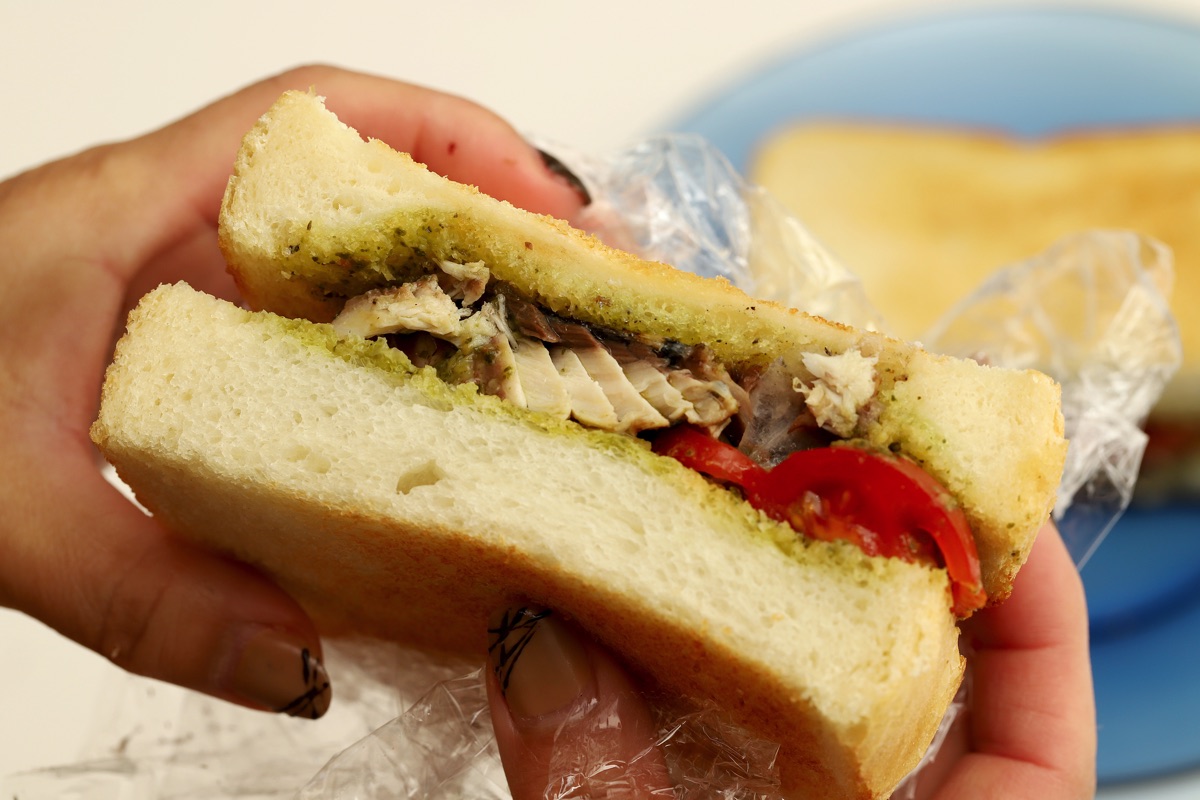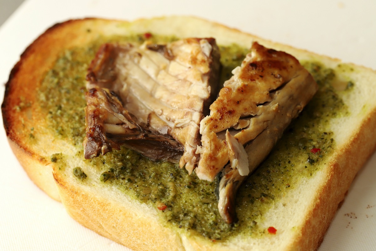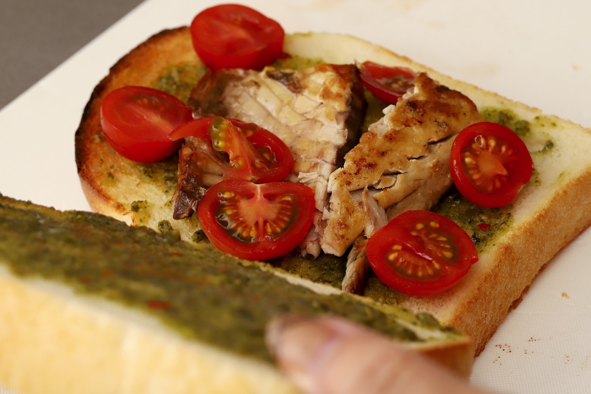 解凍したさばを水けをふいて焼く。トーストしたパンに解凍したジェノベーゼソースを塗り、サバを挟む。