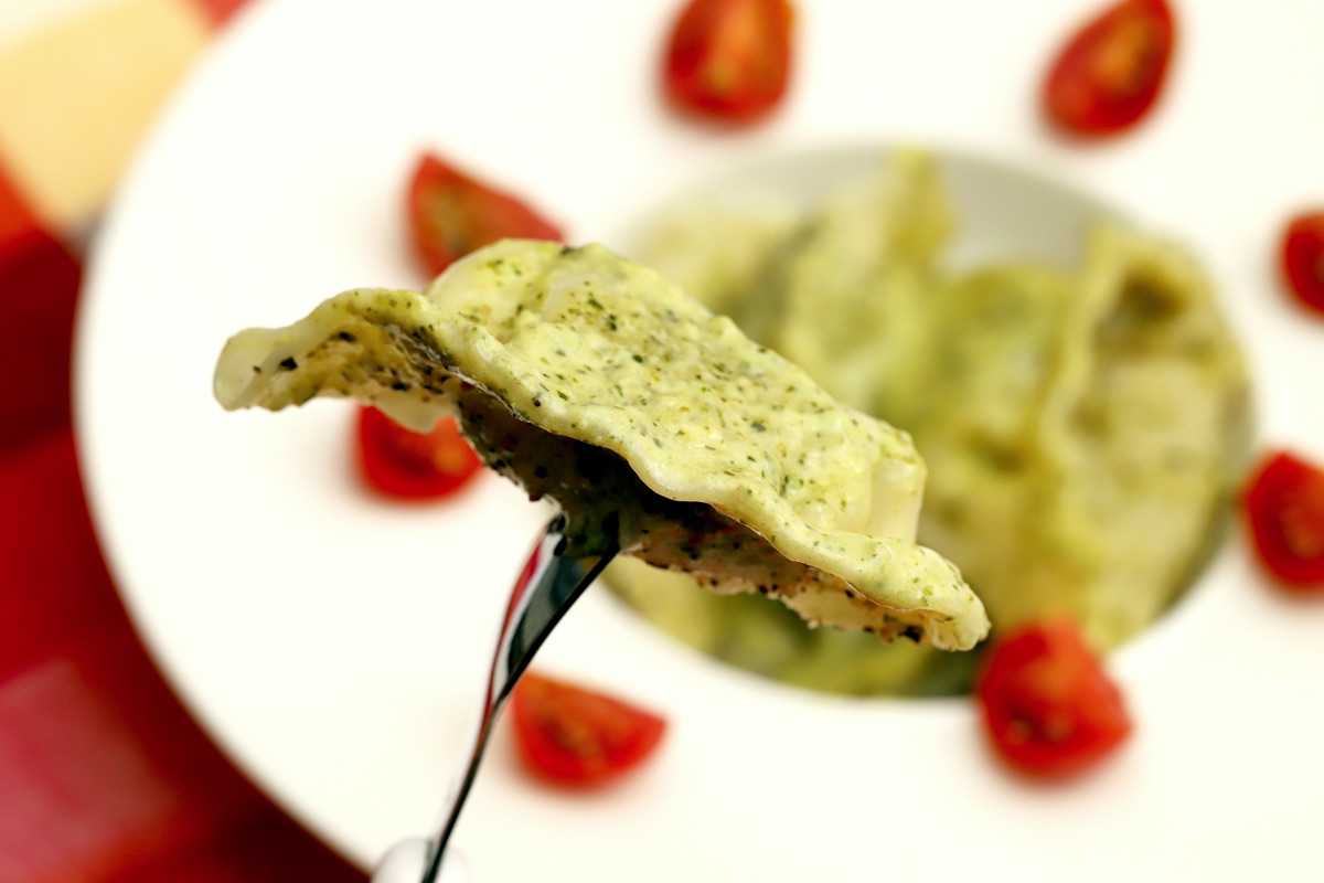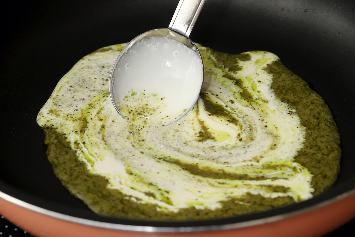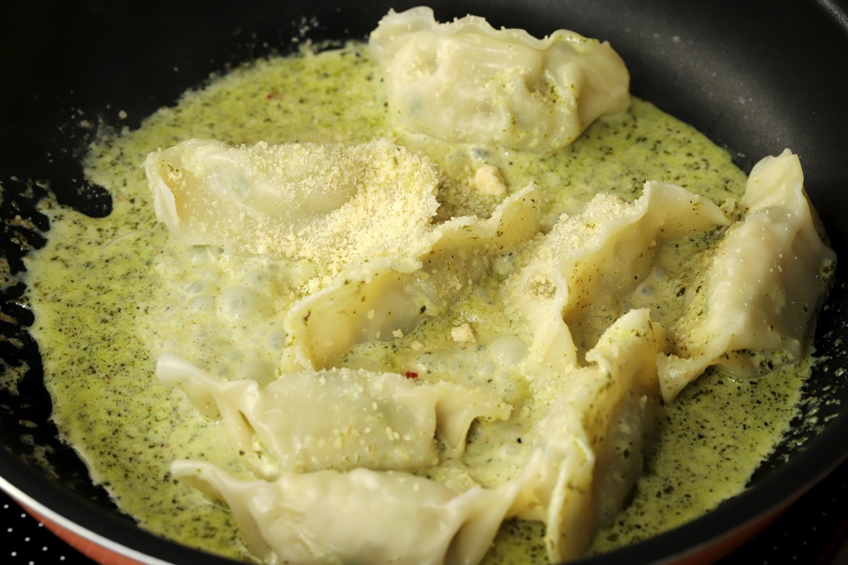 フライパンで、ボイルしたジェノベーゼソースと生クリームを弱火で温め、ゆでた水餃子と絡める。