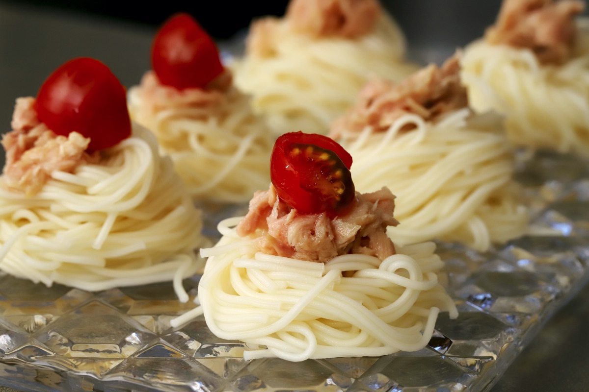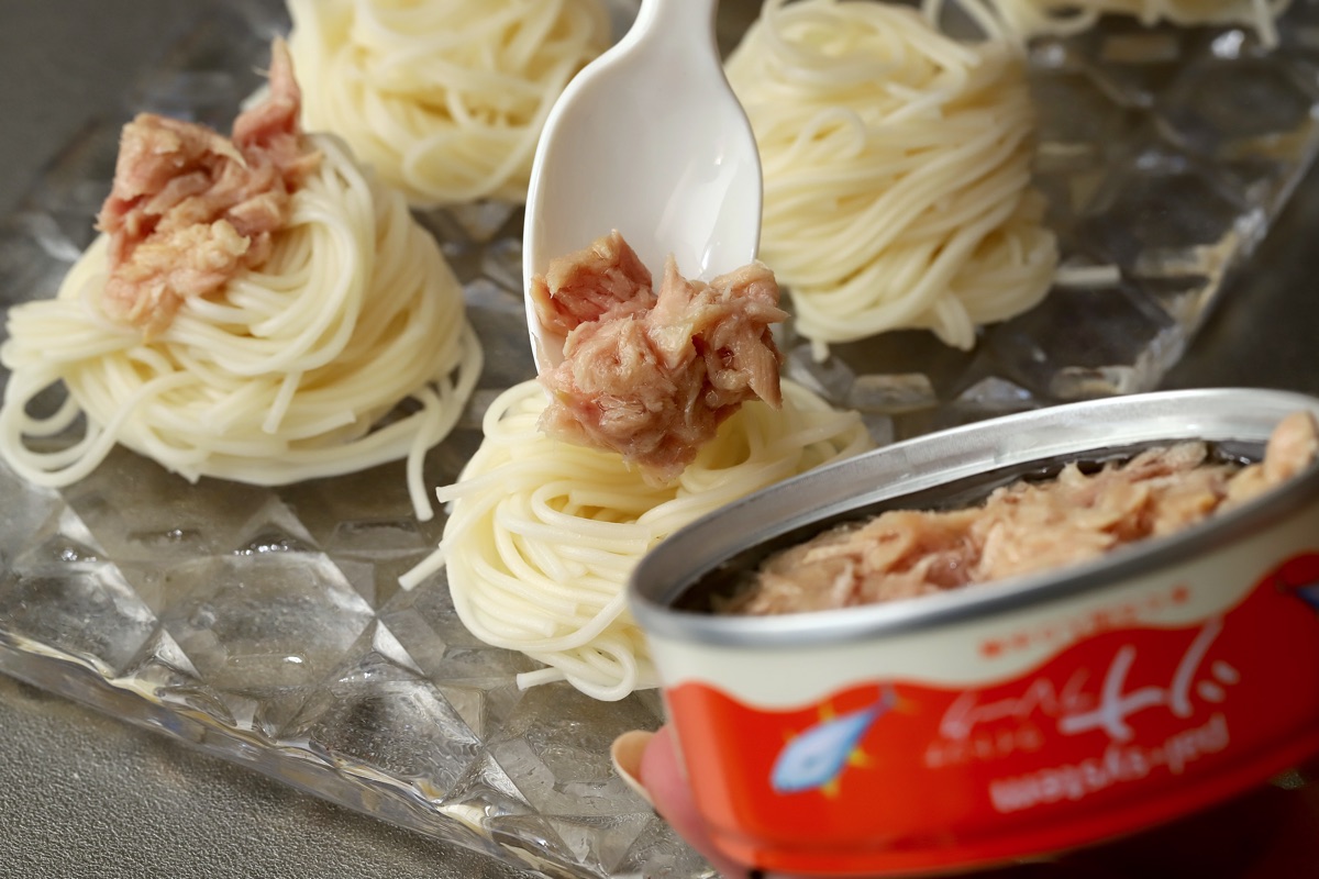 ★を混ぜて、つけ汁にする。ゆでたそうめんを器に盛り、ツナやミニトマトを飾る。