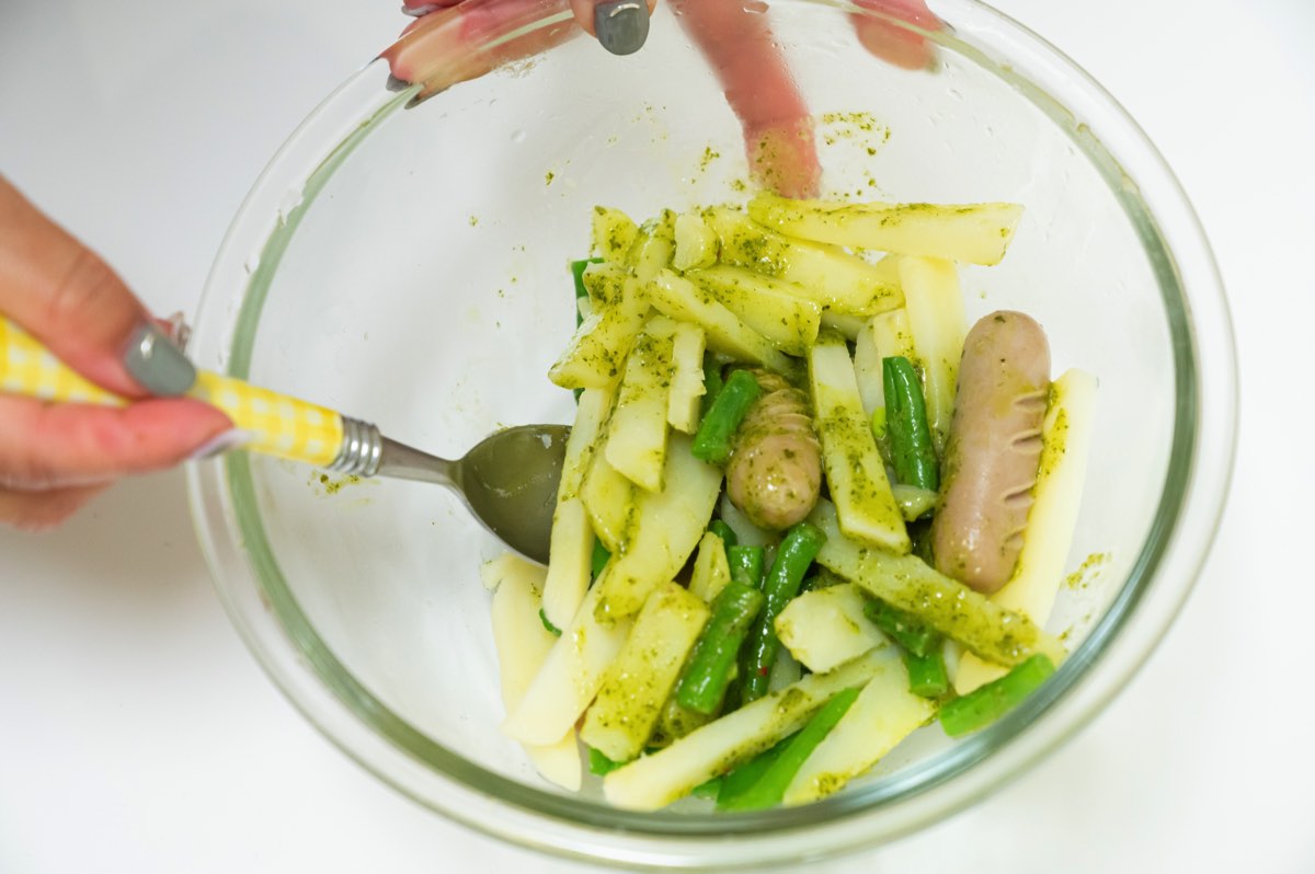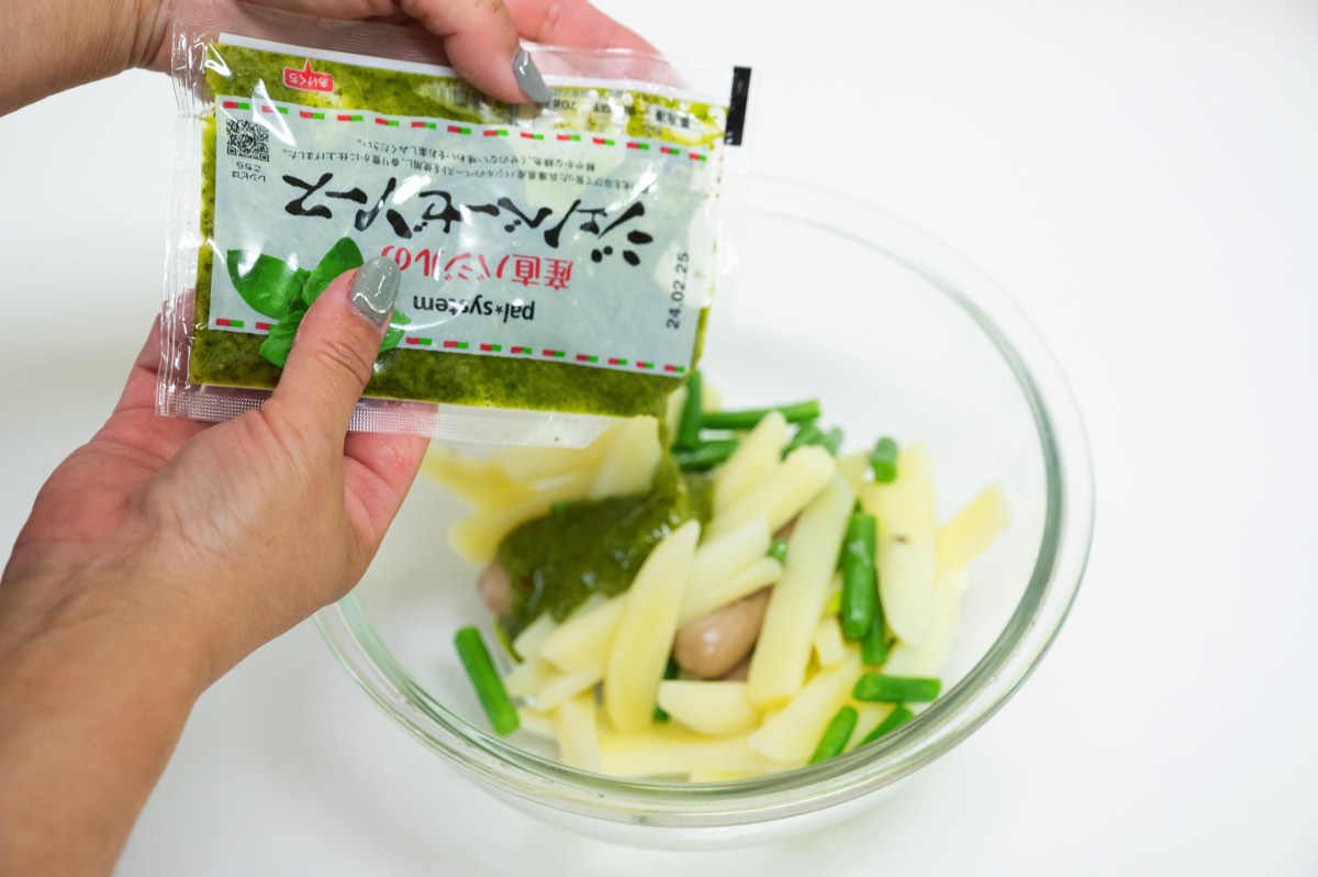 ざるにあげた材料をボウルにうつし、解凍したジェノベーゼソースを全体にあえる。