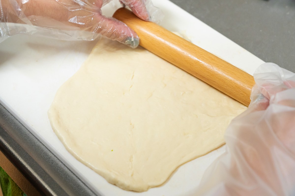 オリーブオイルを少し加えて混ぜ、小分けにしてめん棒で伸ばす。