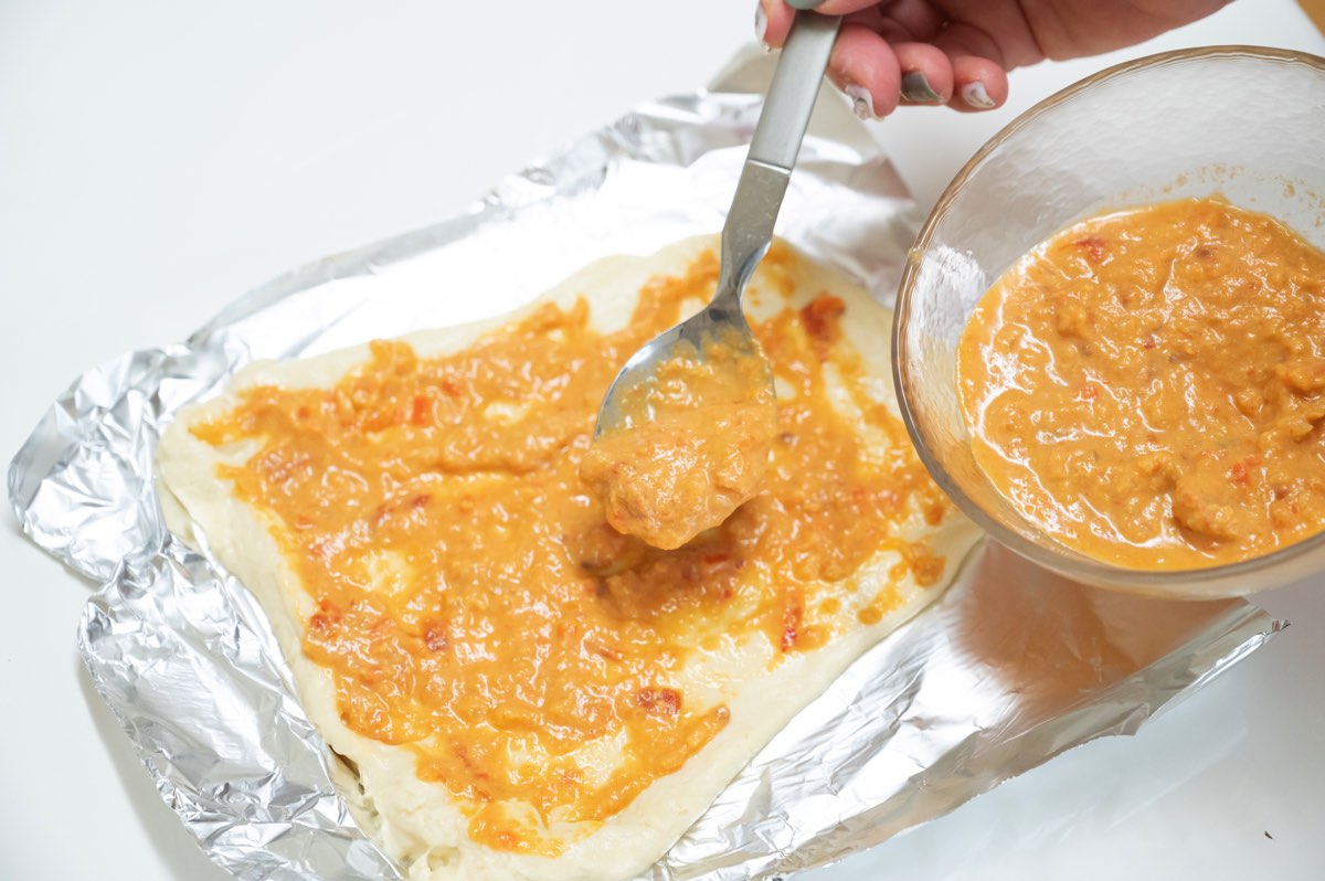 残りのソースをかけて、ピザ用チーズをのせたら、220度のオーブンで10分ほど焼く。