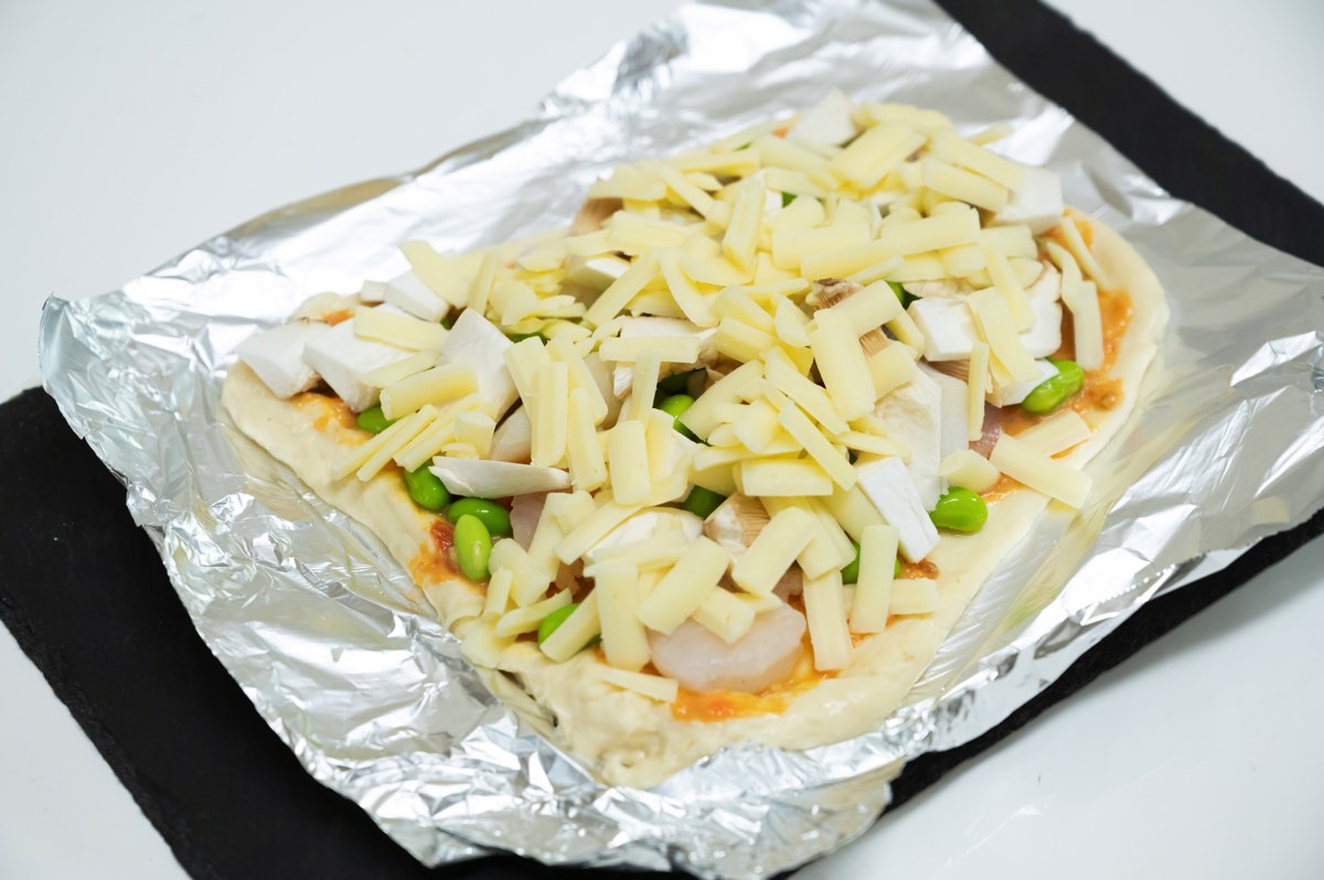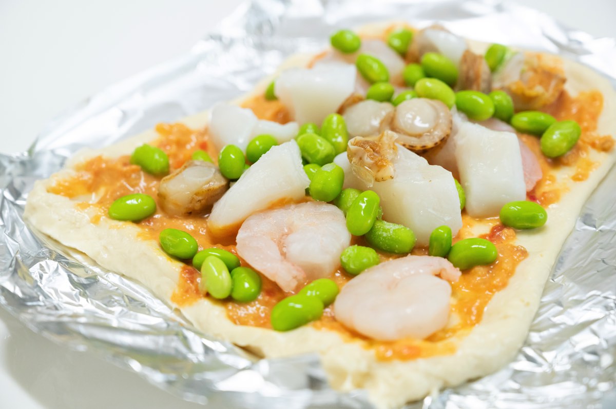 解凍したソースを塗り、解凍して水けをふいたシーフードミックス、凍ったままの枝豆、シュレッドチーズを散らし、240度のオーブントースターで10~15分焼く。