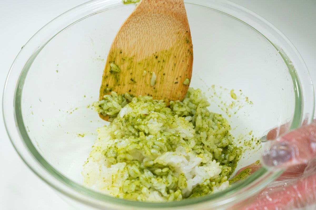 ボウルに産直ごはん(パック)とジェノベーゼソースを混ぜ合わせる。