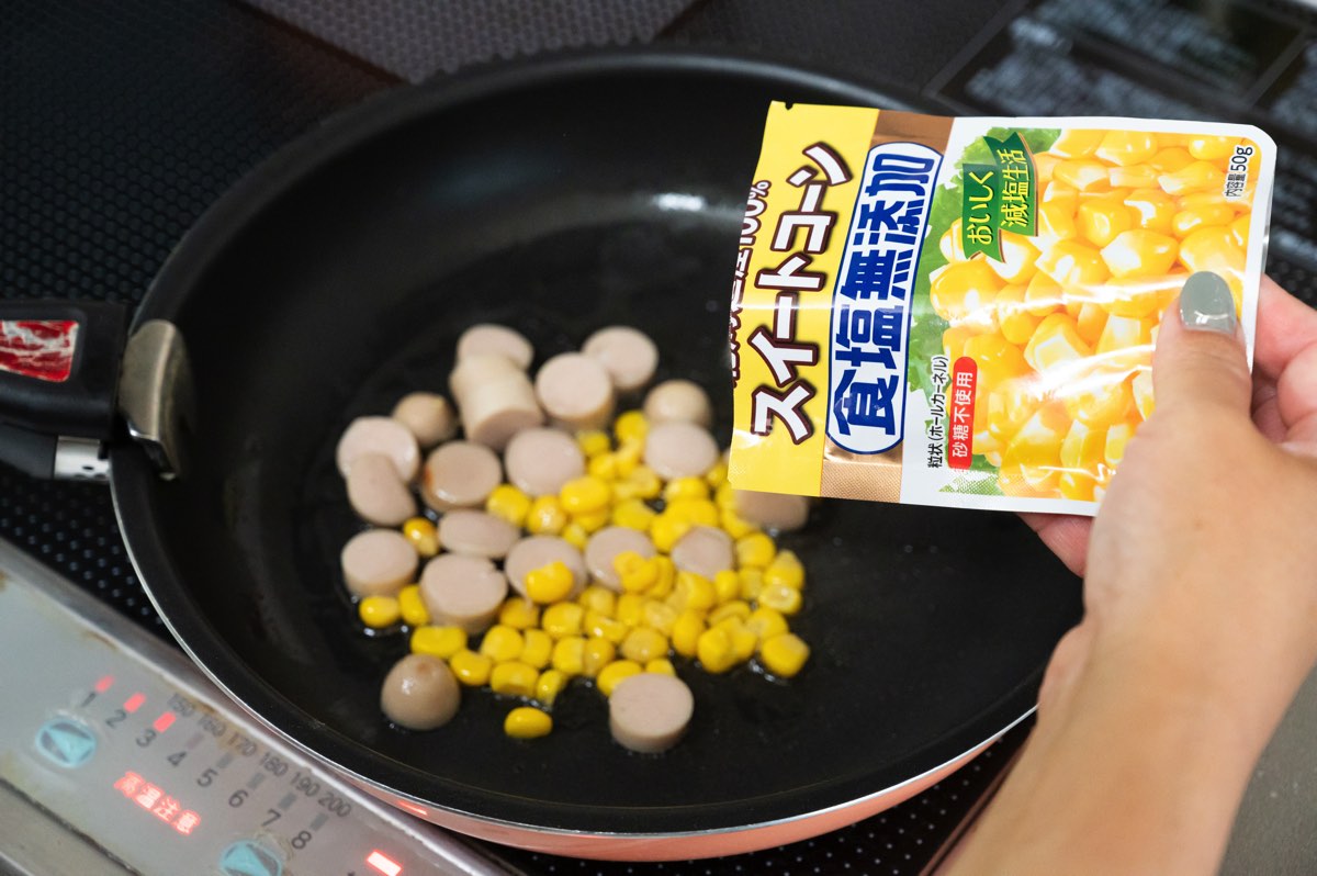 フライパンにコーンと輪切りにしたウインナーを軽く炒め、塩・こしょうで味を整えたら、ソースをあえたごはんを一緒に炒める。