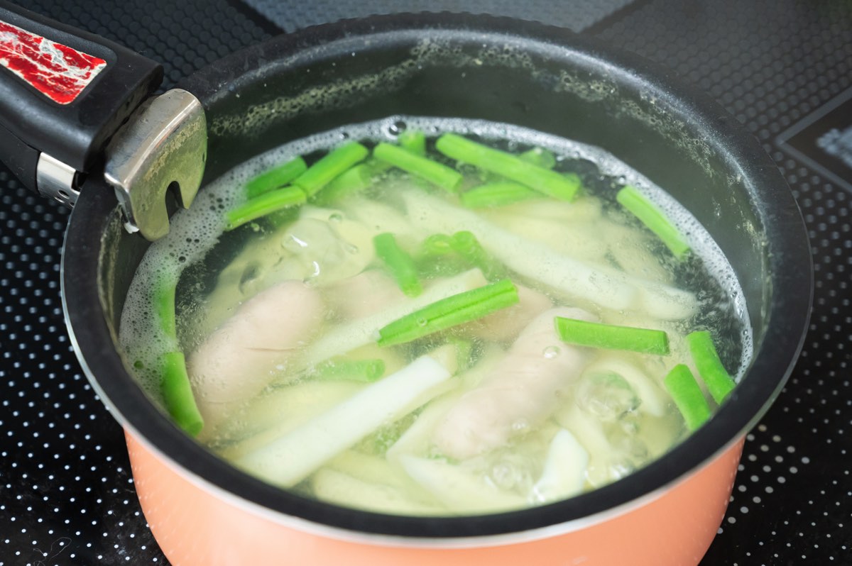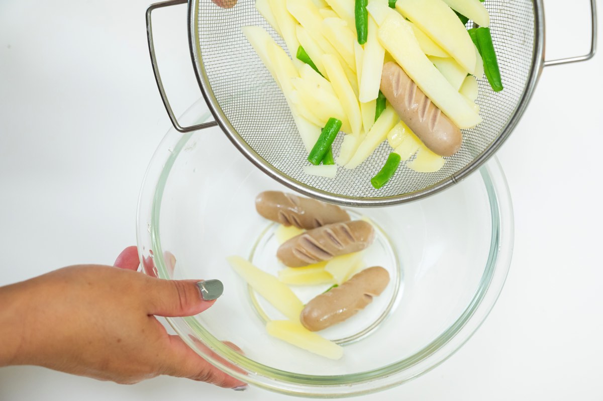 鍋に水と塩を入れたら、先にじゃがいもを約5分ゆでる。続いて、いんげん・ポークウインナーを加えて約3分ゆでる。