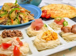 - ①玉子焼きを作って、ひと口サイズにカットする。