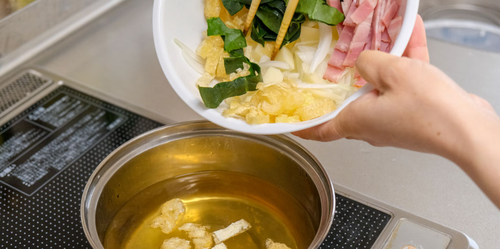 具材を食べやすい大きさに切り、鍋のだし汁の中に具材を入れる。