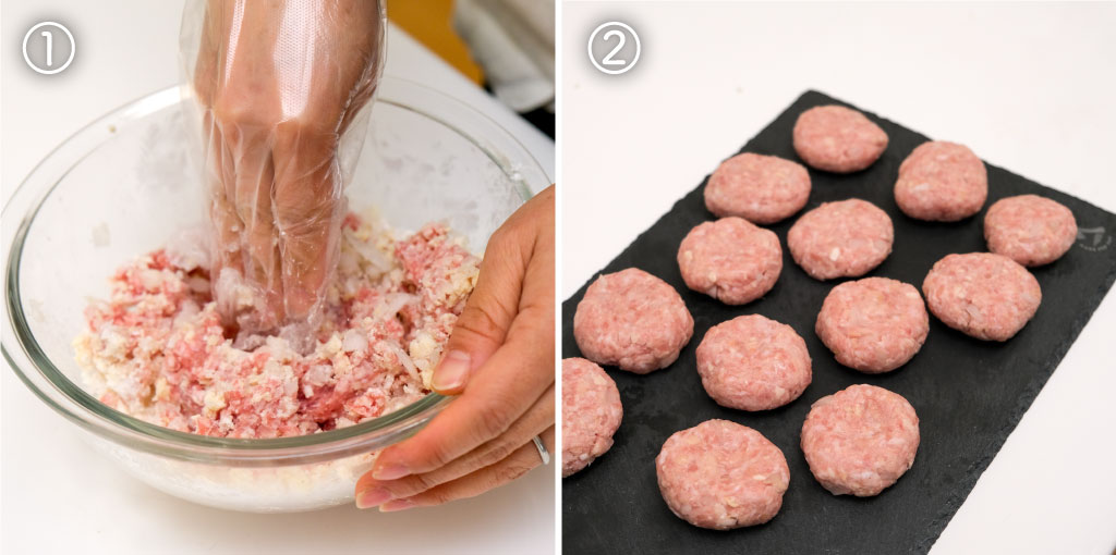 ★の材料をすべて混ぜ合わせ、よくこねて、30gぐらいの肉団子を作る。