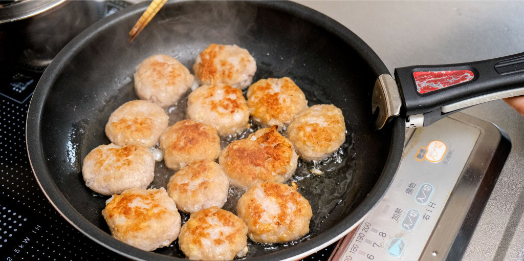 フライパンに油を入れ、火が通るように肉団子を転がしながら揚げ焼きをする。
