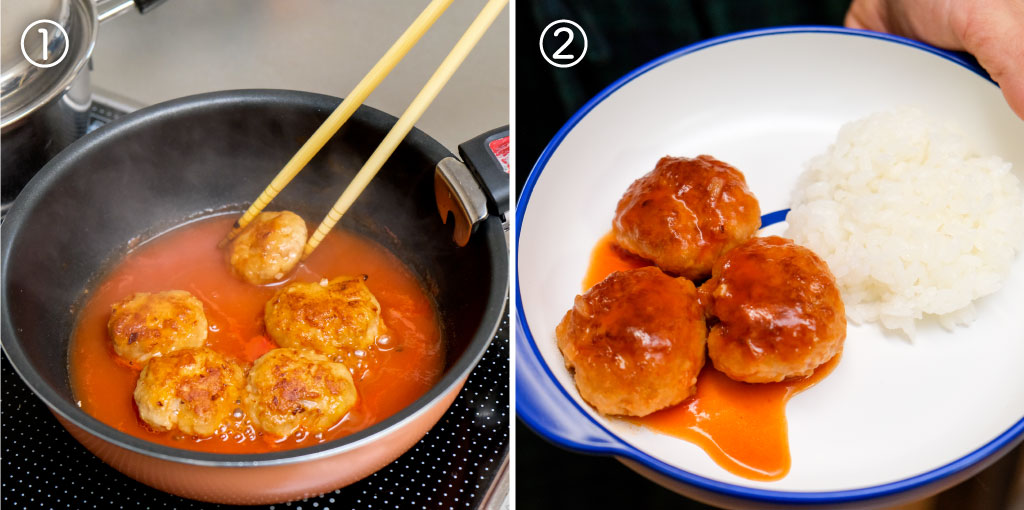 鍋にトマトケチャップ、砂糖、水を入れ火にかけ、揚げ焼きにした肉団子を入れ、5分程度煮からめる。