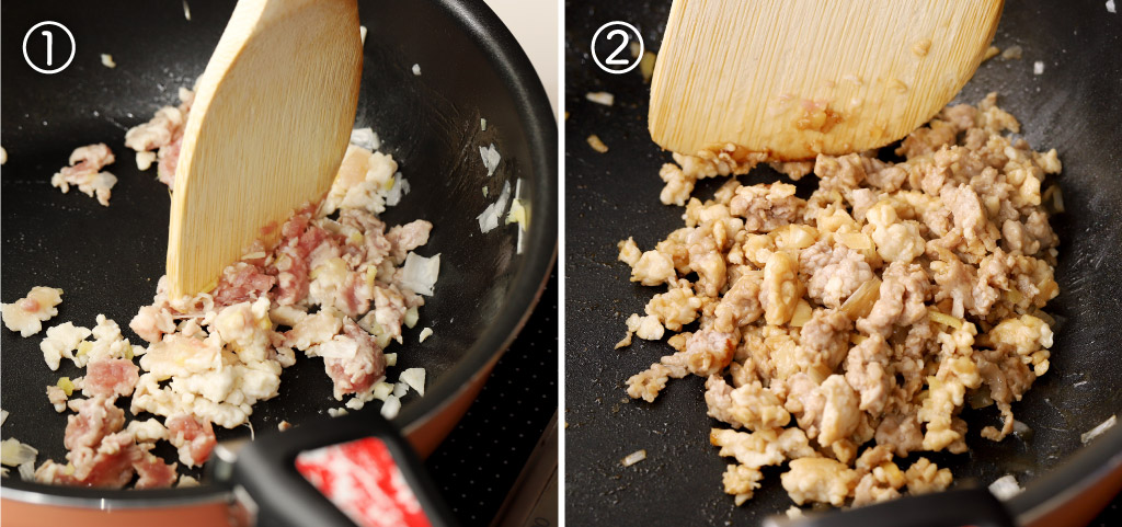 油でおろししょうがとニンニク、みじん切りにしたネギ、ひき肉の順に炒め、醤油、酒、塩、砂糖を加えて汁気がなくなるまで炒める。