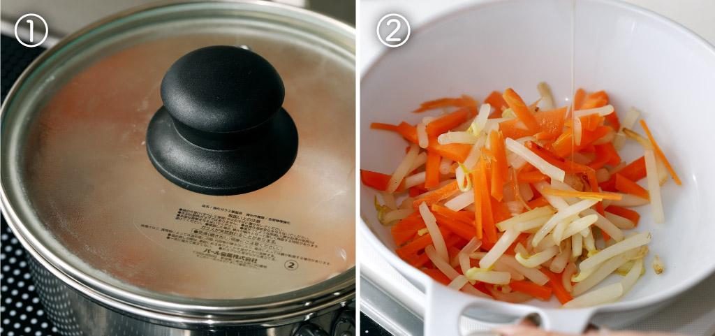 鍋に食べやすく切ったもやしとせん切りのニンジン、水、塩を入れて蓋をして火にかける。