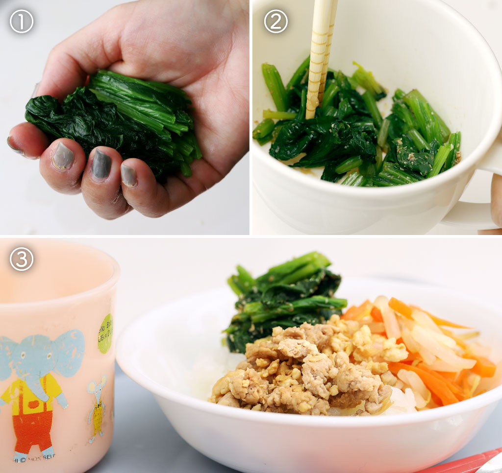作り方も味つけもとってもシンプルなのに、驚くほど美味しい!!3歳未満児向けには味つけを少し薄めに調整、大人用であれば濃い目に。タンパク質、鉄分、カルシウム、ビタミン、繊維がバランスよく摂れる、優秀丼!