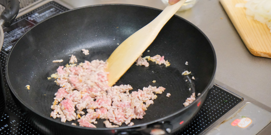 フライパンに炒め油を入れて、にんにくを加え、香りがしたら豚ひき肉を炒める。