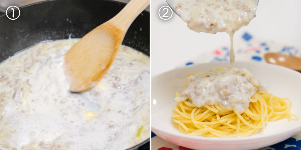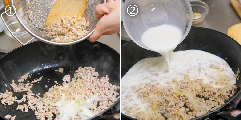 玉ねぎ、ごぼうをよく炒め、火が通ったら牛乳、生クリームを加えて加熱する。
