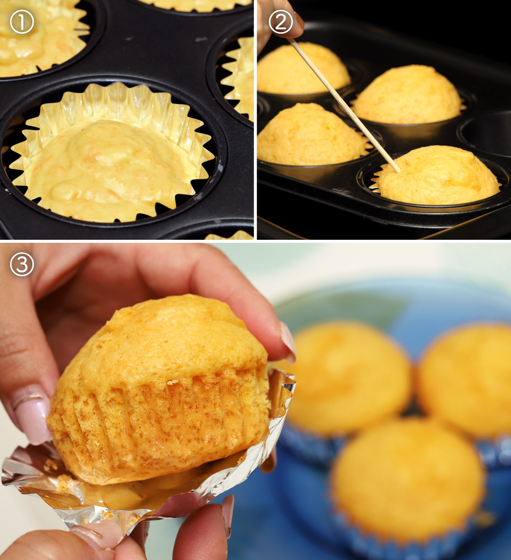 マフィンのカップに生地を入れ、180℃に熱したオーブンで15~20分焼く。