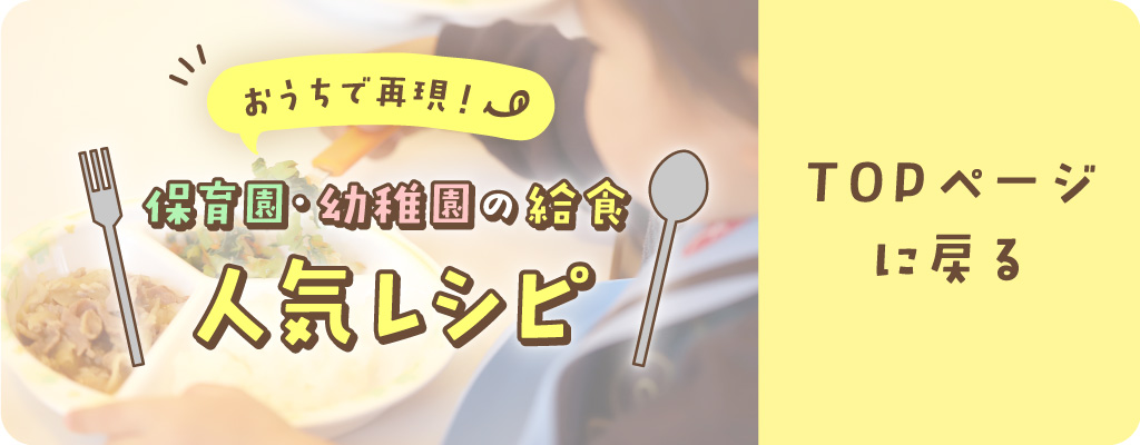 ※このコンテンツでご紹介するレシピは、保育園の献立の一部です。盛り付けや、材料、分量などは、家庭で作りやすいようにアレンジしているため、実際に保育園で提供されているメニューとは異なる場合がございます。