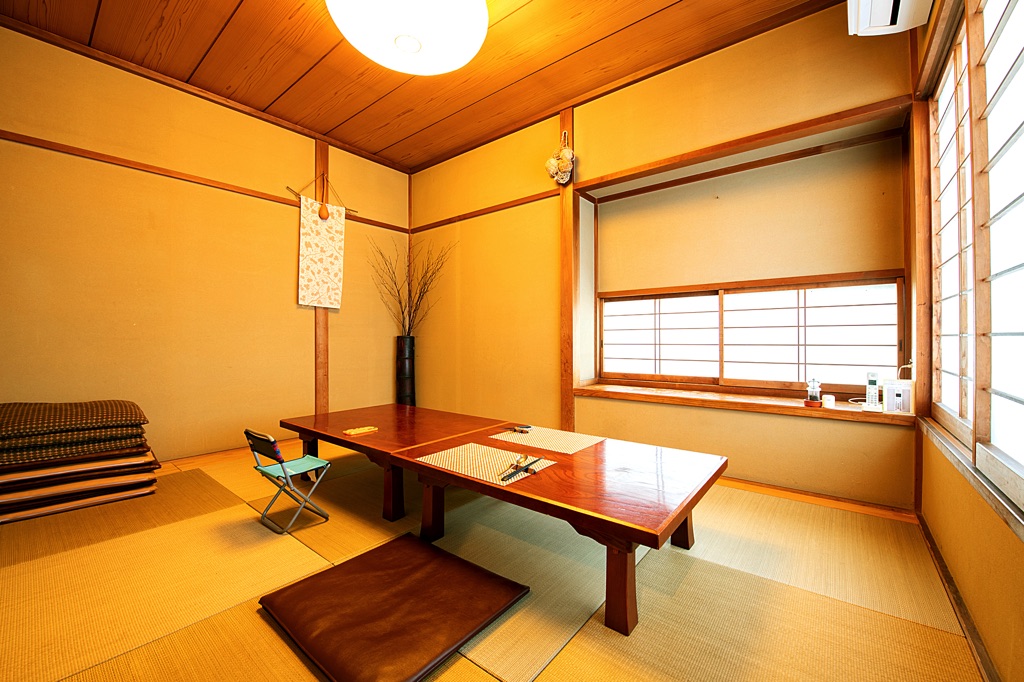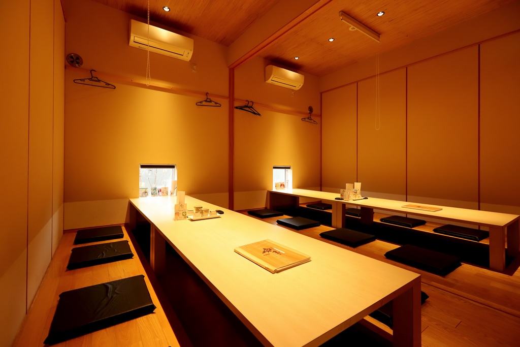 知らなければ通り過ぎてしまいそうな、和風一軒家のうどん屋さん。ごく普通のお宅にお邪魔するように靴を脱いで中へ。暖簾の奥には畳敷きの洗練された和空間が広がる。バウンザーやお布団も貸してくれ、赤ちゃん連れでも安心。