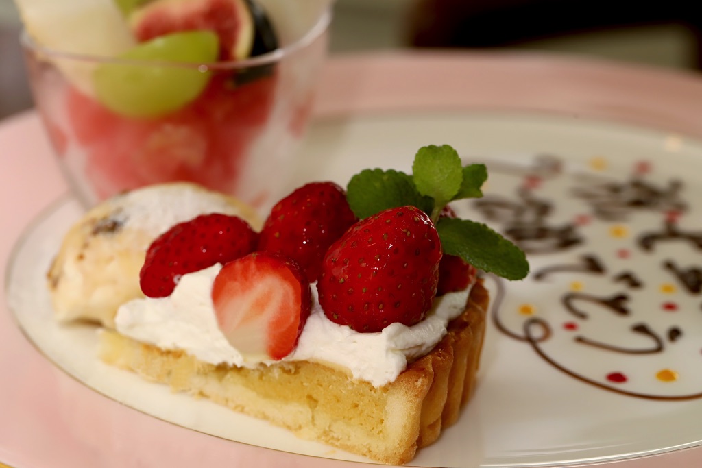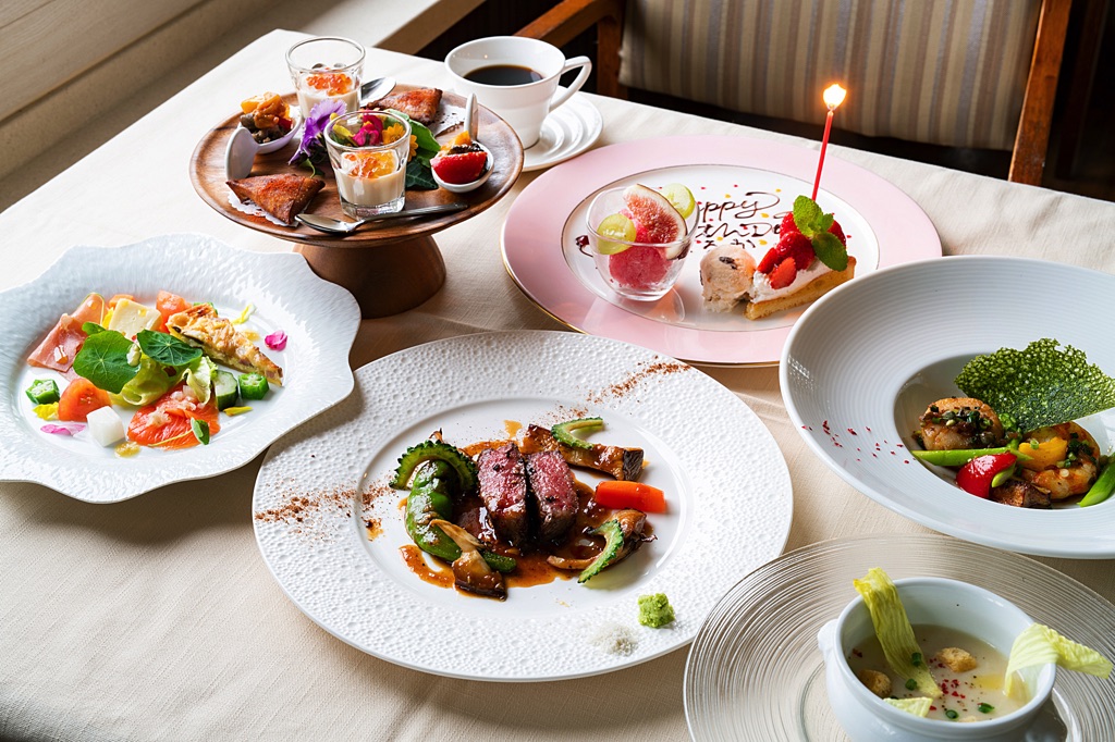 A5ランクの黒毛和牛ステーキをメインに、その時期に最も美味しい山梨の食材で組みたてたフルコース。デザートプレートは、自家製アイスと共に季節の手作りフルーツタルトが絶品!名前を入れることもでき単品でも(880円)。 ※内容は季節・仕入れにより異なる。3日前までに要予約