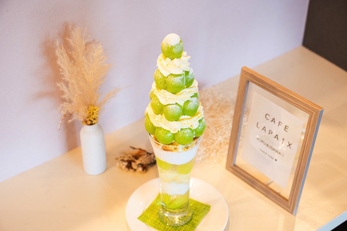 秋のお楽しみは、シャインマスカットとラぺ特製のホイップしたマスカルポーネクリームが3段に積み重なったシャインマスカットのクリームチーズパフェ!