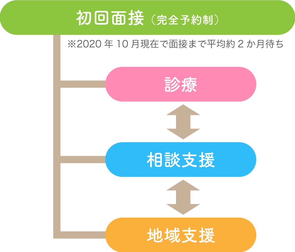 初回面接(完全予約制)※2020年10月現在で面接まで平均約2か月待ち/診療/相談支援/地域支援