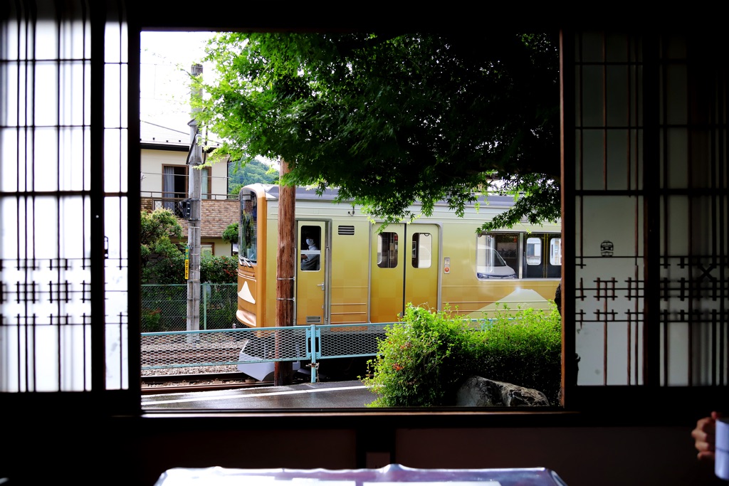 客室のある離れの入り口では、寝台列車のブルートレインがお出迎え!