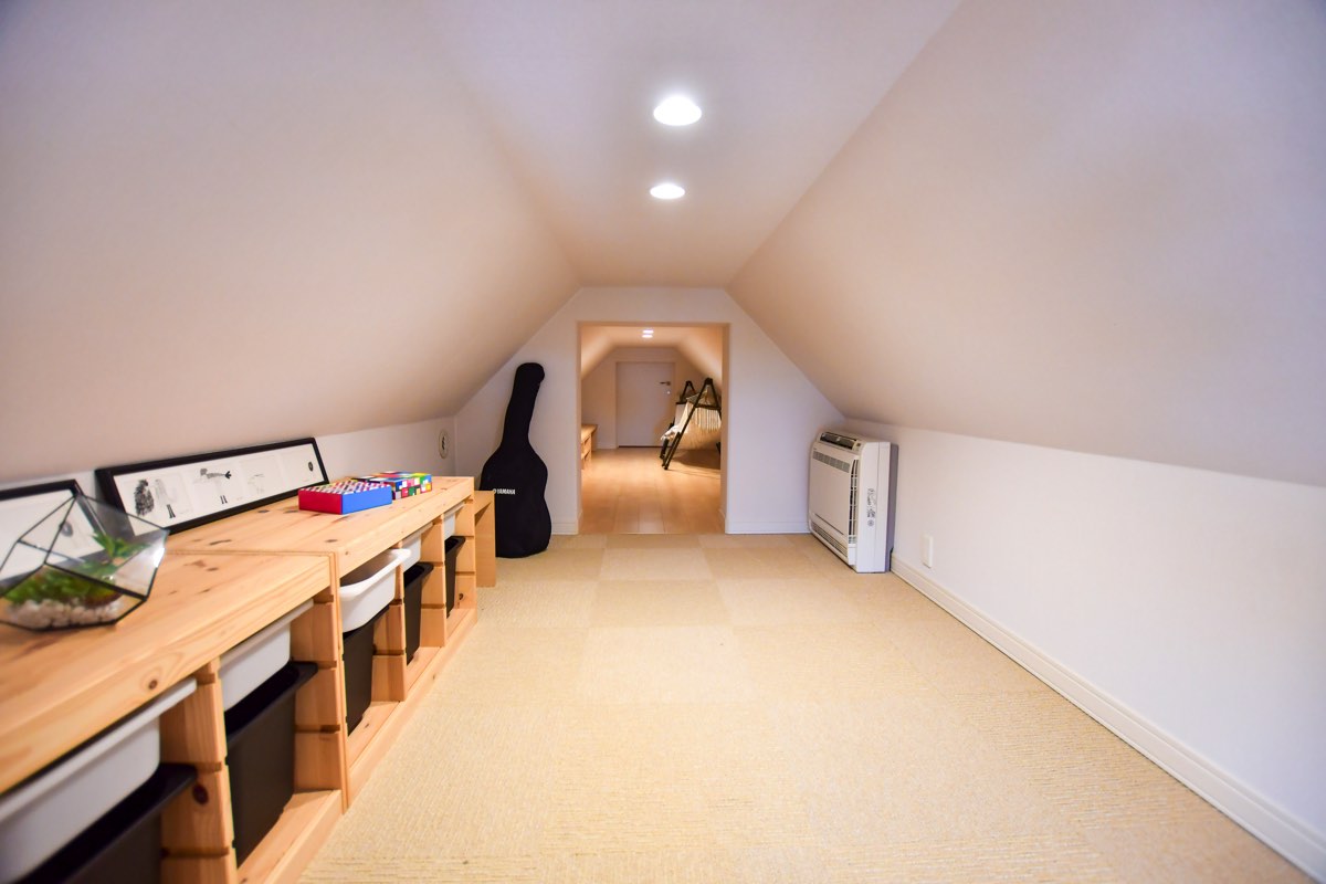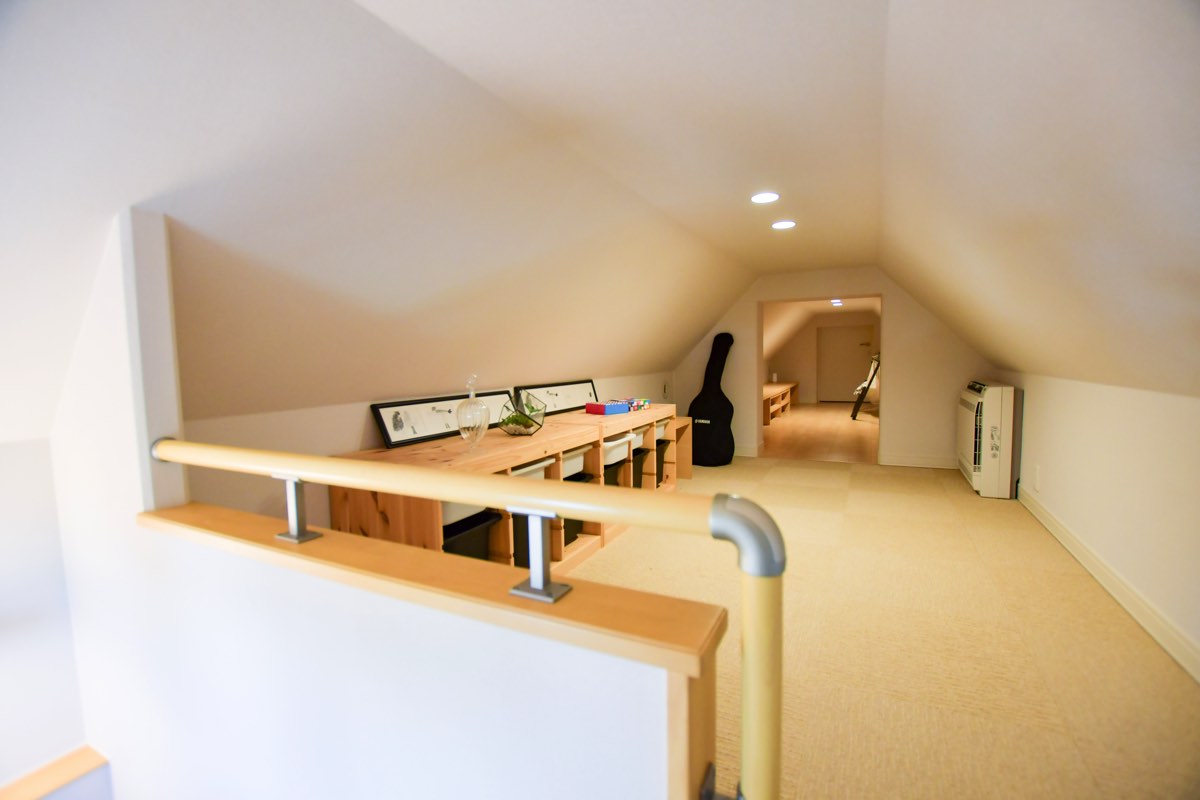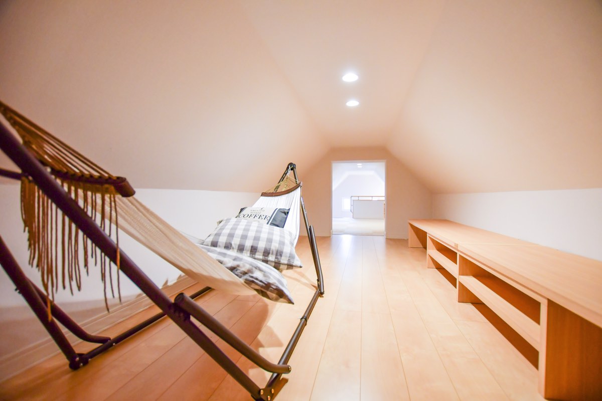 360度白の壁紙で圧迫感を感じさせない設計が魅力的。小窓からは光が差し込み、屋根裏でも明るい印象に。全館床暖房と高い天井から伸びる吹き抜けのおかげで、小屋裏まで通気性が良く、まるで過ごしやすい隠れ部屋!ソファに腰掛けながら映画や読書を楽しんで、自分ひとりだけのとっておきの時間を過ごすのも良さそうだ。屋根の形状上、出来てしまうデッドスペースは扉を設置し、大容量の収納スペースも確保できるなど、活用の幅も広げられるのも嬉しい。