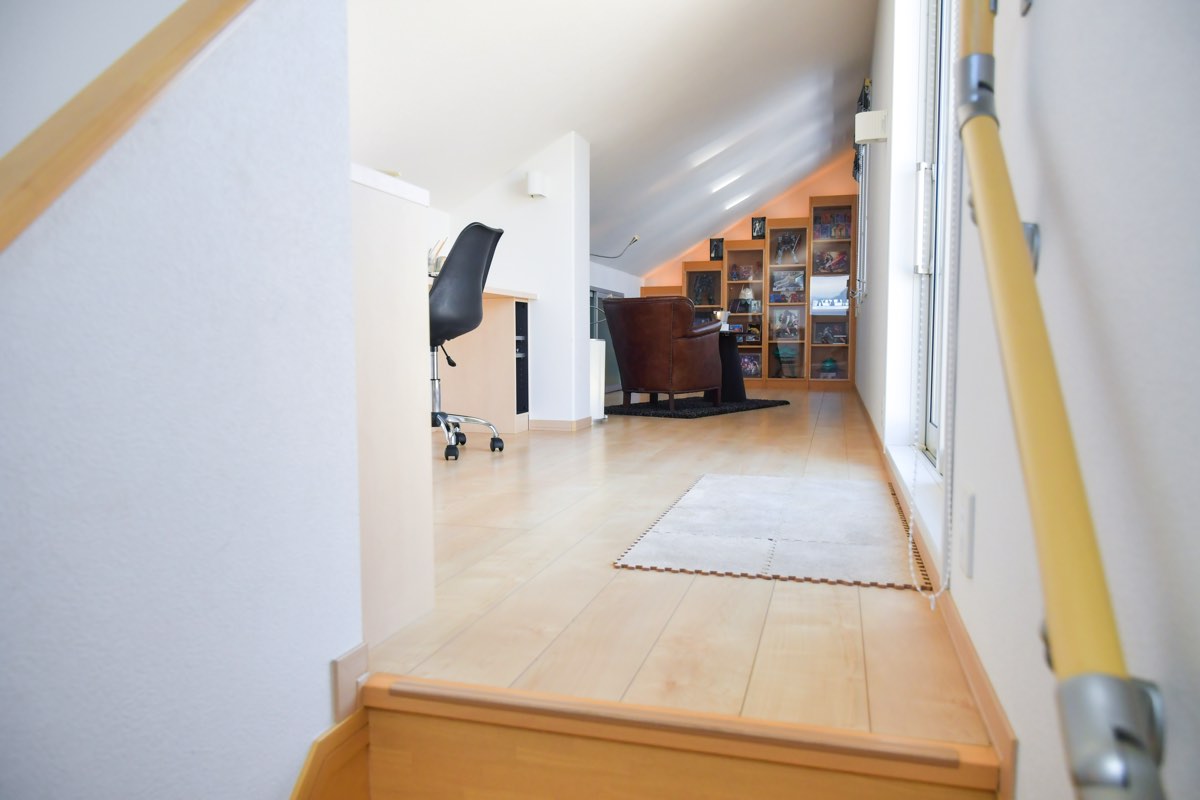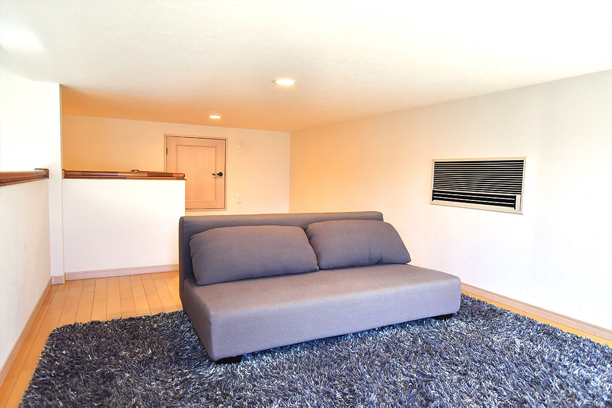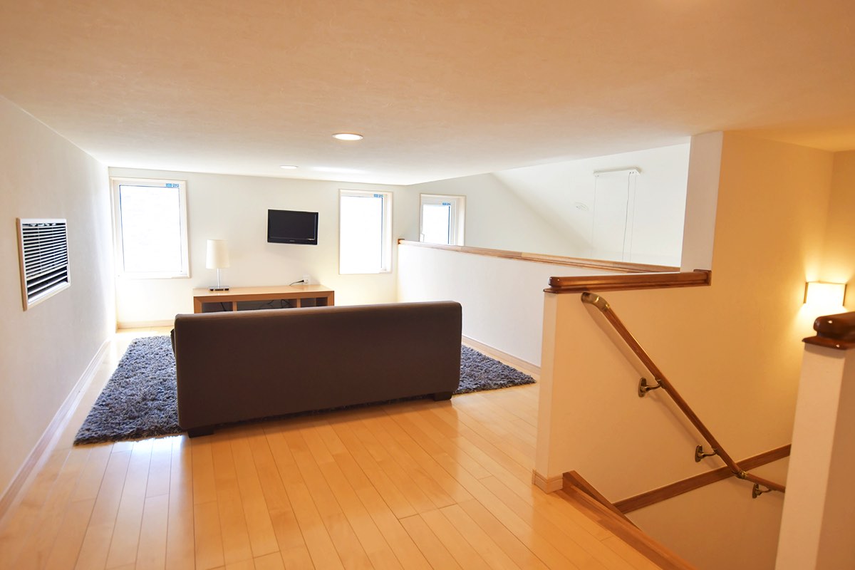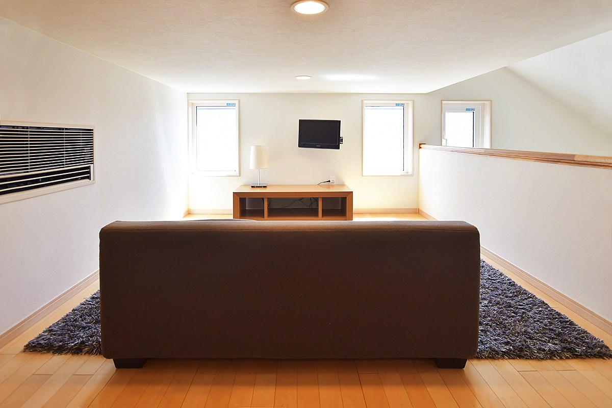 360度白の壁紙で圧迫感を感じさせない設計が魅力的。小窓からは光が差し込み、屋根裏でも明るい印象に。全館床暖房と高い天井から伸びる吹き抜けのおかげで、小屋裏まで通気性が良く、まるで過ごしやすい隠れ部屋!ソファに腰掛けながら映画や読書を楽しんで、自分ひとりだけのとっておきの時間を過ごすのも良さそうだ。屋根の形状上、出来てしまうデッドスペースは扉を設置し、大容量の収納スペースも確保できるなど、活用の幅も広げられるのも嬉しい。