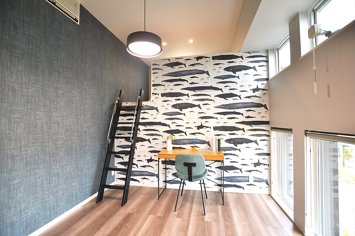 ロフト部分を部屋スペースとして活用し、ロフトにベッドが置けるのも、屋根断熱と全館空調の合わせ技の賜物。広さの基準を面積ではなく、立体で考えた立米設計だからこそ、部屋の隅々まで使って斜めの勾配天井、吹き抜け、ロフトなど、広い縦空間を実現できる。建築士とインテリアコーディネーターなど専門家による家づくりで、柄を組み合わせた壁紙でもすっきり。隣の部屋に通じる小さな扉も可愛い。