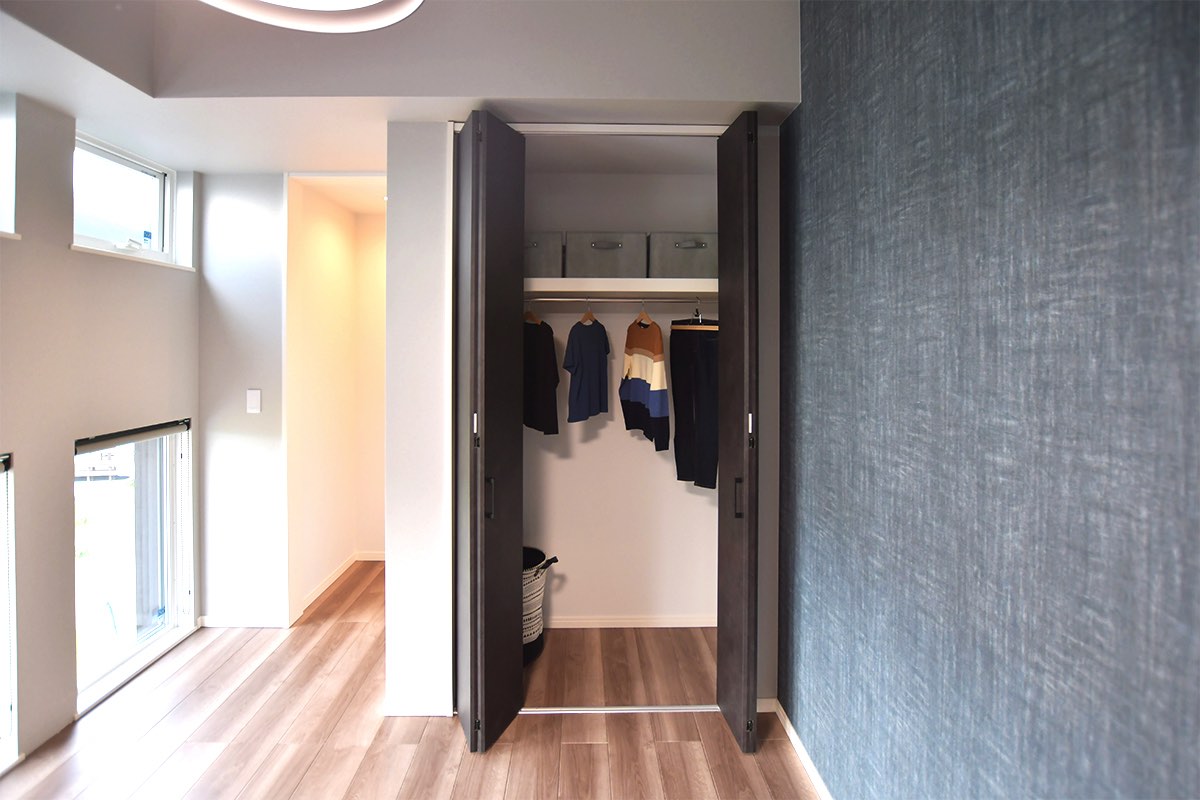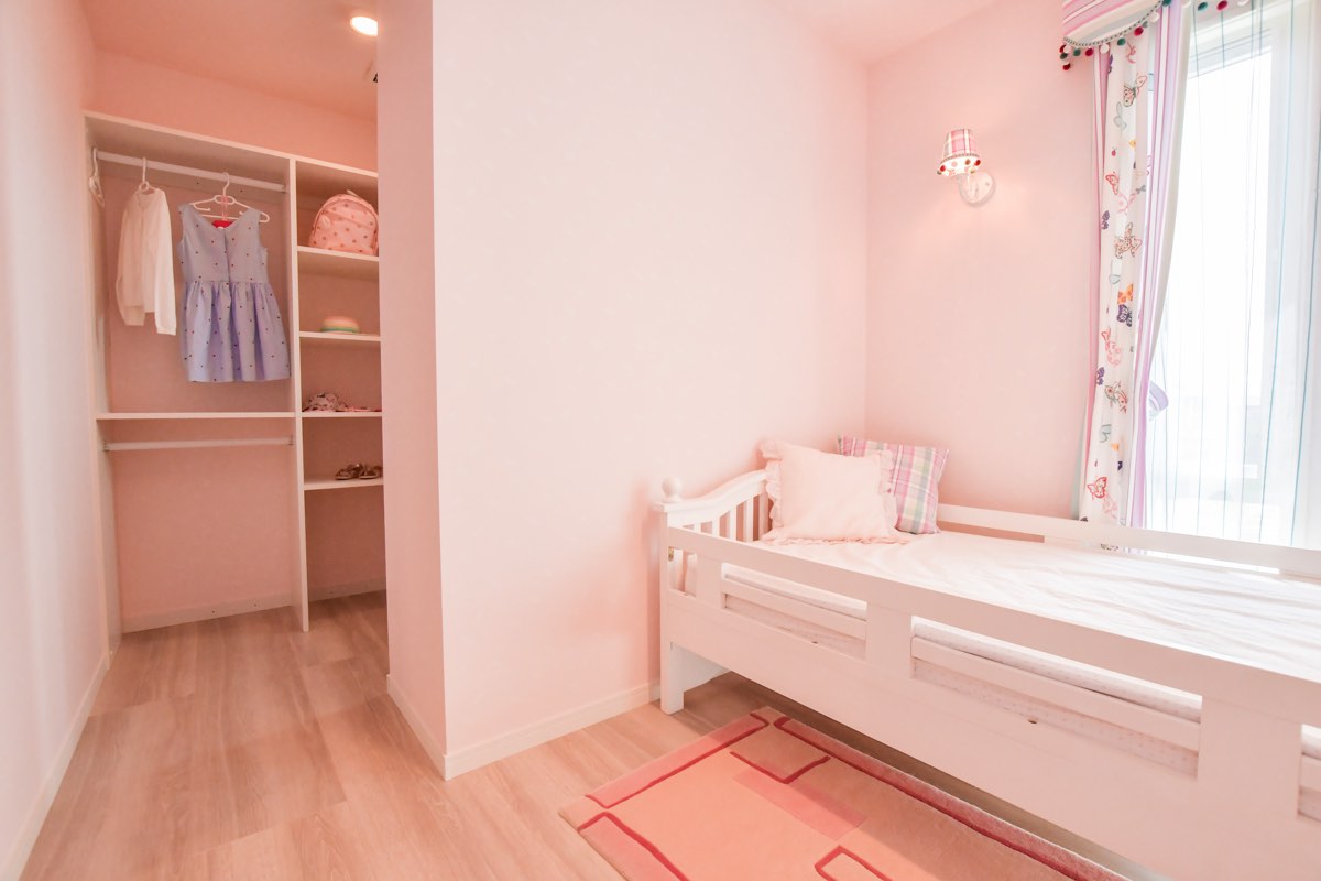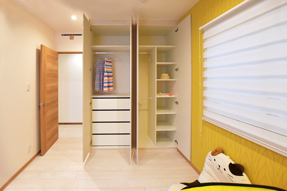 子どもにとってロフトスペースはワクワクする秘密基地。天井高がある子ども部屋ならぜひ取り入れたいところ。また、部屋の片隅にリビングに繋がる小さな入口をつくり、その先を遊ぶ空間にすると、リビングに玩具を散らかし放題!という悩みを解決できるだけでなく、親の目も行き届き、子どものワクワク度もアップしそう。ウォークインクローゼットは、成長に応じて増える収納にも対応。