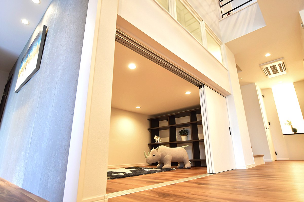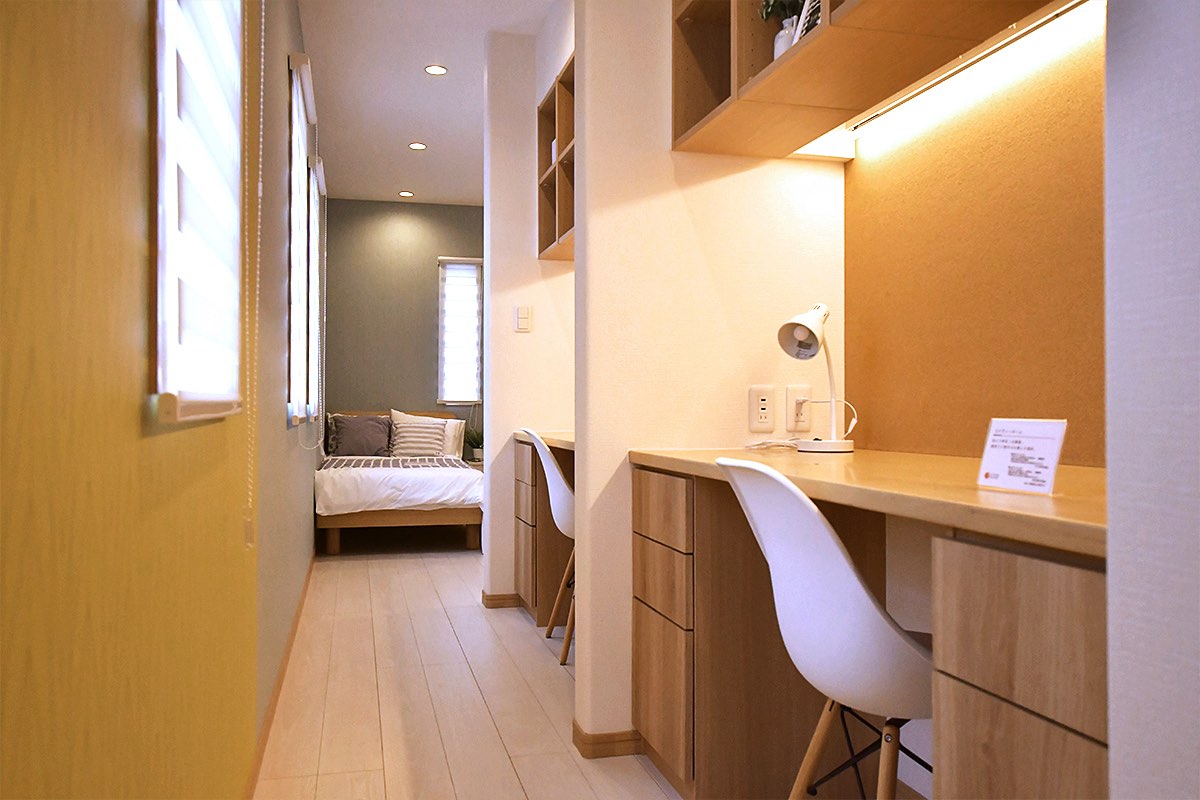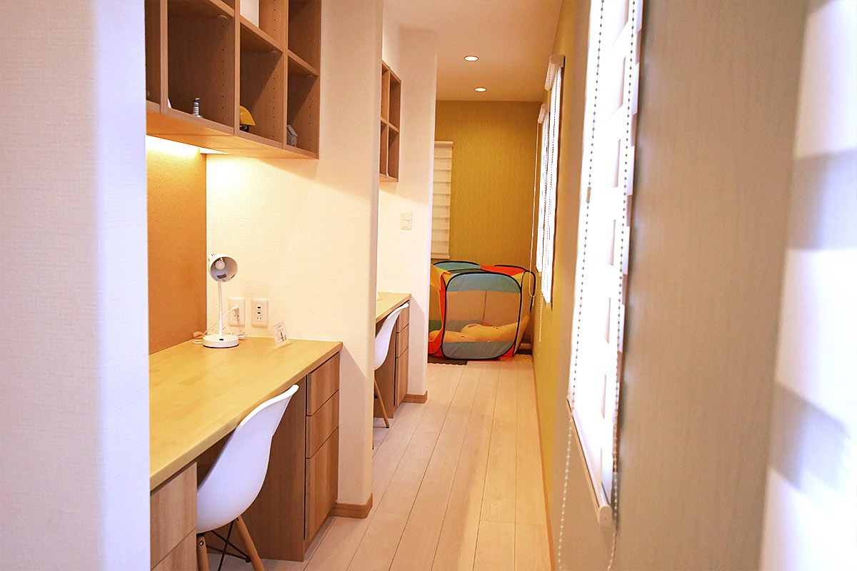 コンセプトは「家族それぞれのスタイルを大切にする家づくり」。まるで隠れたお部屋のようなスタディルームはデスクを横並びにすることで、子ども部屋に出来たデッドスペースを有効活用し、ママやパパが一緒に並んで勉強を教えたり、兄弟で教え合ったりすることが叶う。壁に向かうスタイルのため、壁面にスケジュール表などを貼り、学習の状況をひと目でわかる工夫がされている。また、ドアを初めから2つ設けているため、子どもの成長に応じて間仕切り壁を設置し2間にすることも可能。将来的に部屋の形を変化できるのも嬉しい。