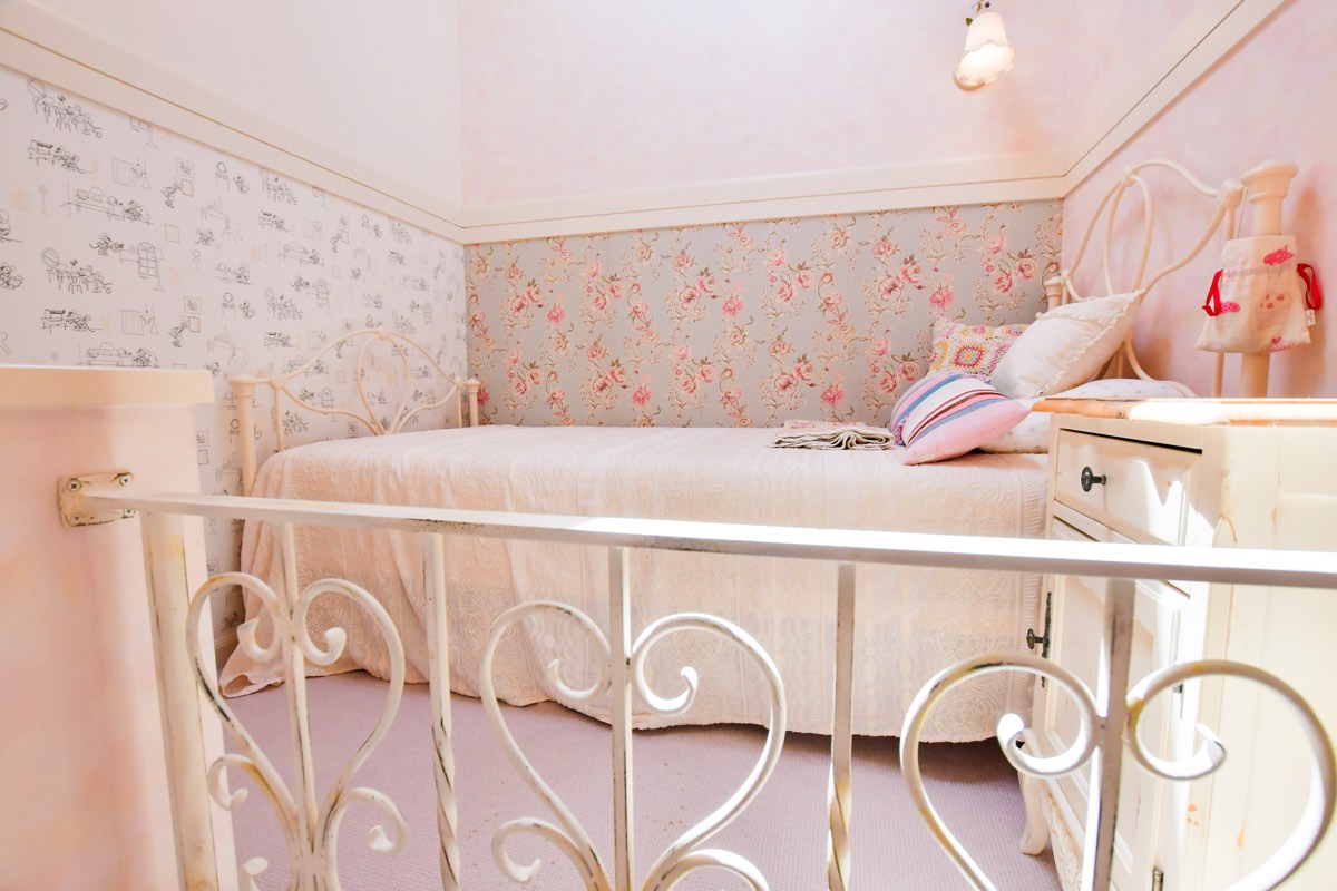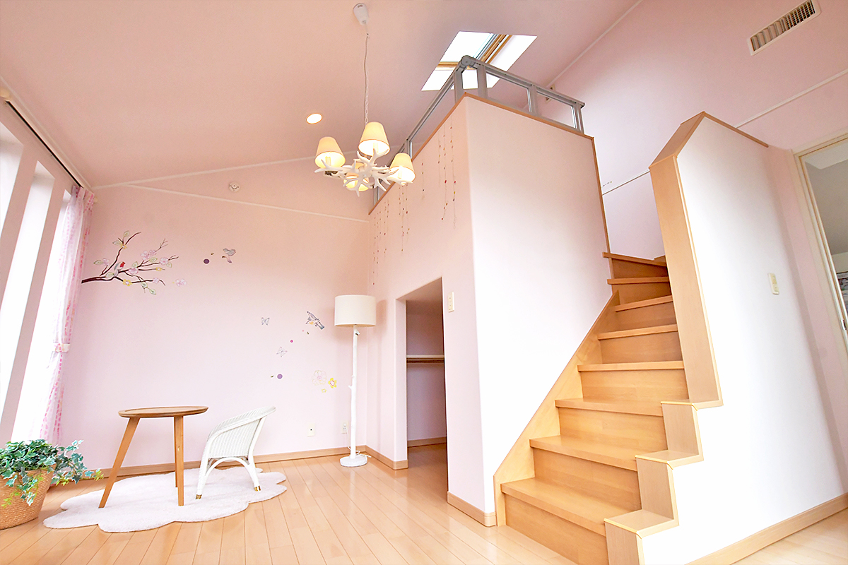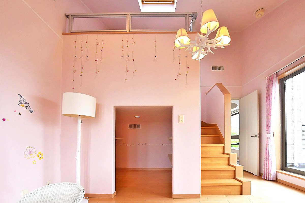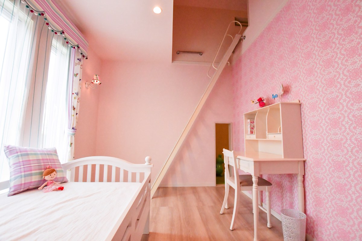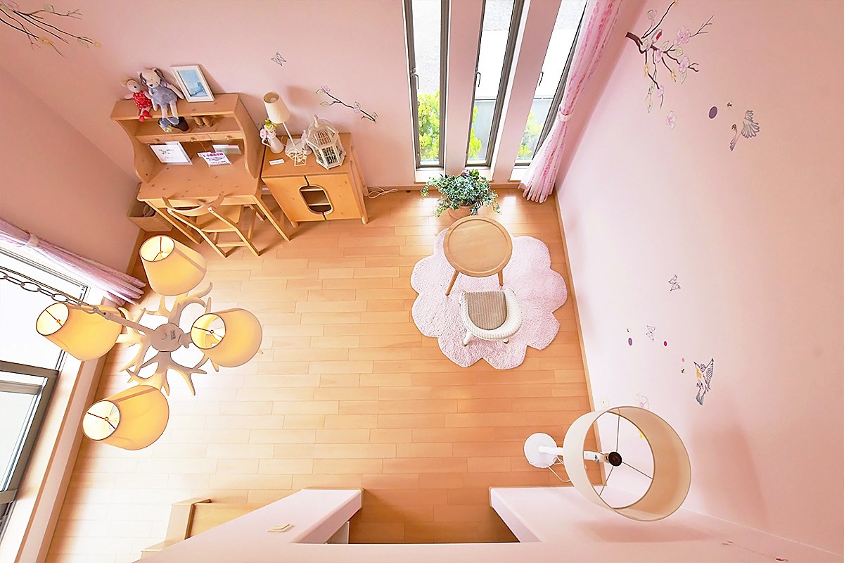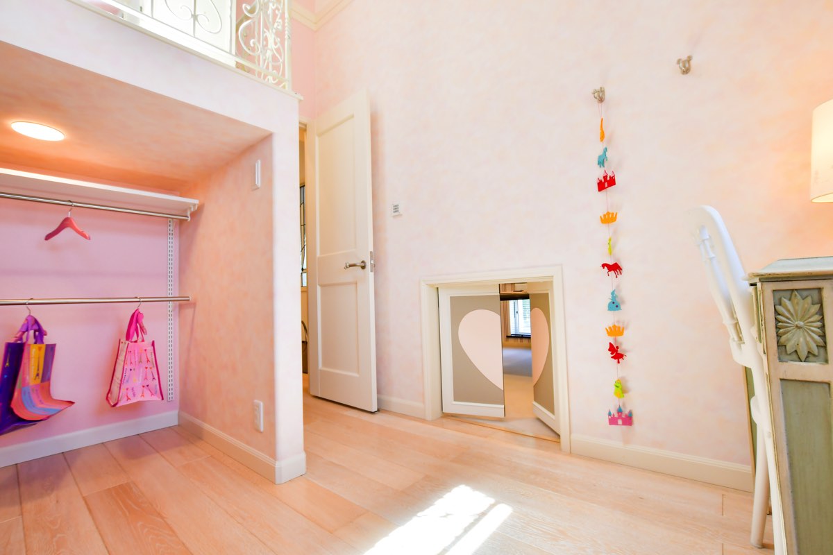 自分だけの世界にどっぷりつかれちゃうようなメルヘンなお部屋に、子どもも思わず釘付けになること間違いなし。ロフトの天井には吹き抜けのガラスがついているので、夜は星空を眺めながら眠りにつくことができそう。また、ロフト1階には、収納スペースが。小さな子でもお片付けを楽しめるよう、あえて扉を付けない工夫を。ここをちょっとした“おこもりスペース”として利用したり、そのままおもちゃや服などの収納として利用したりと、使い方自由自在だ。