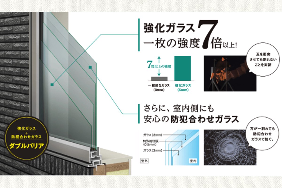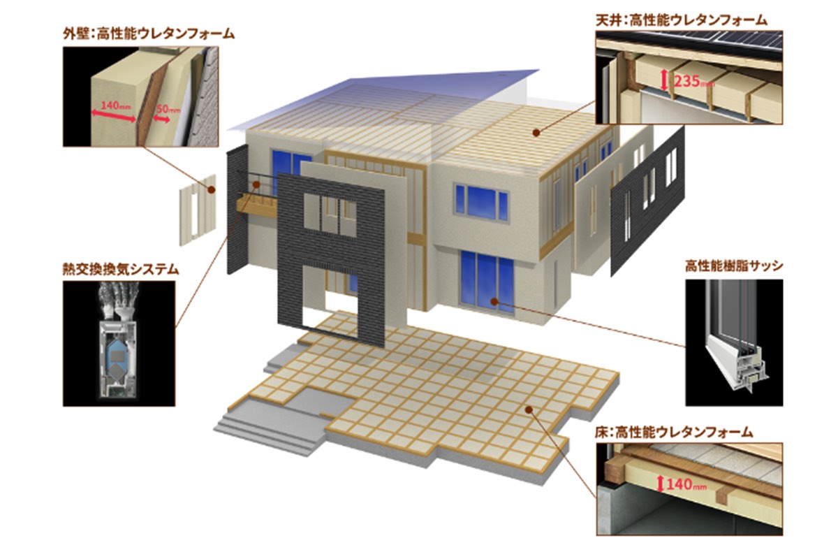一条工務店の4枚のガラスを使用した「強化ガラス採用トリプル樹脂サッシ」は、「ペアガラスアルミサッシ」の約5倍の断熱性能を持つハイスペック建具。さらに、壁には最大190mmの外内ダブル断熱工法を採用することで、国内屈指の快適な住まいを実現。