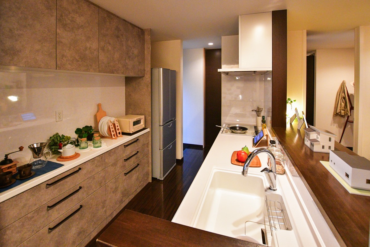 オープンカウンターのオリジナルキッチンは解放感抜群!家族とコミュニケーションをとりながらお料理ができる。さらにカップボードは家電も含めてすべて隠せる壁面収納!キッチンがいつでもすっきりキレイに!