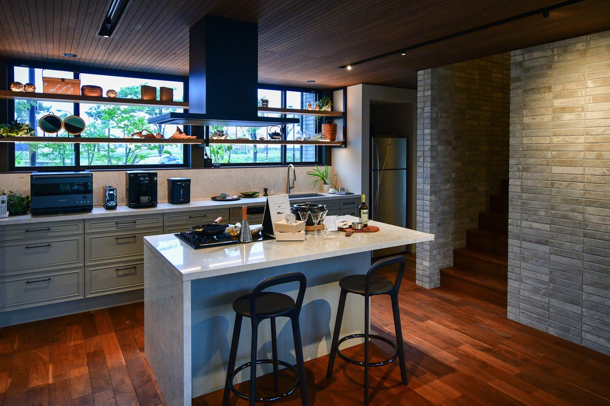 家族で一緒に料理作りを楽しめるような、人が集まれる形。オープンなキッチンは調理中も会話や笑顔が絶えず、一体感が生まれる温かな空間を演出。